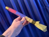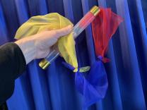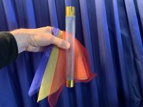 Sie zeigen ein durchsichtiges Kunststoffrohr und drei verschiedenfarbige Tücher: rot, gelb und blau in der Grösse 30 x 30 cm. Die Tücher werden nun einzeln, eines nach dem anderen, in das Rohr gestopft. Sie blasen dann in das Rohr mit den Tüchern und diese fliegen in hohem Bogen heraus. Sie sind aber plötzlich verknotet! Ein Mirakel ohne Fingerfertigkeit!