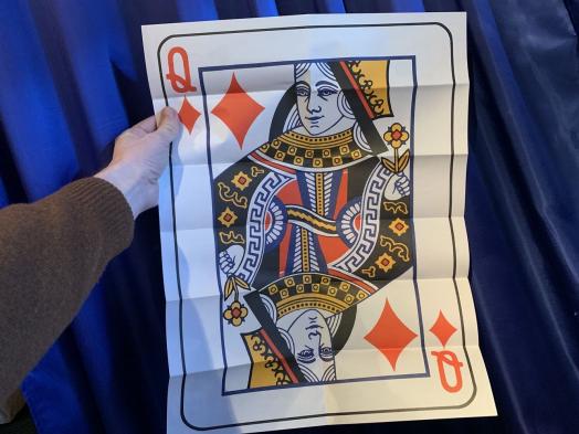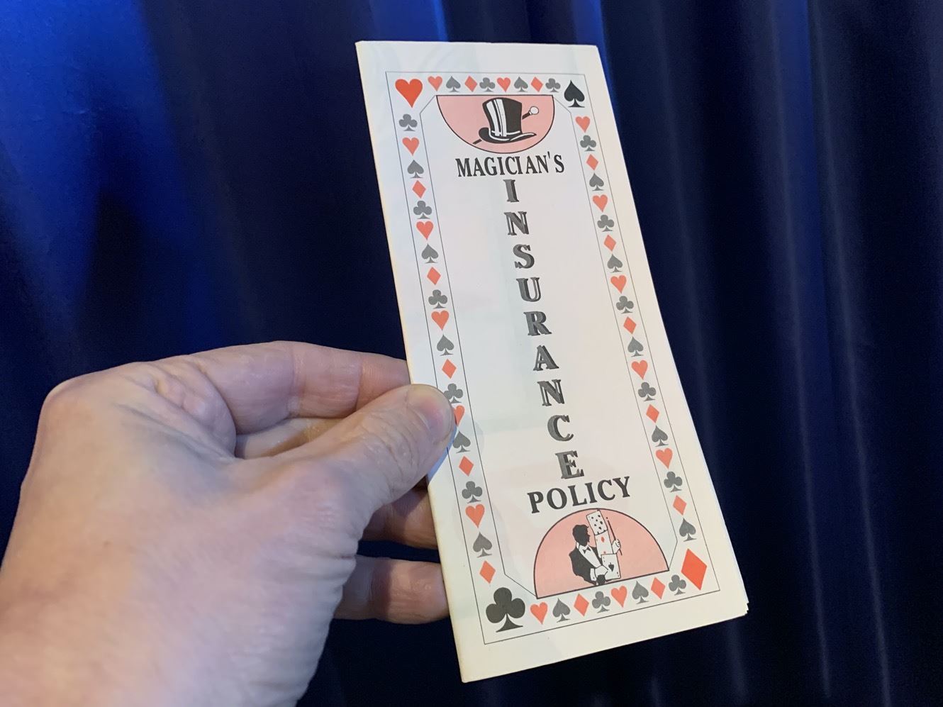 Da sagen Sie, Sie hätten für diesen Fall eine Versicherung abgeschlossen. Sie ziehen eine entsprechende Police aus Ihrer Tasche und zeigen sie den Zuschauern. Wenn sie aufgefaltet wird, sieht man den Versicherungstext. Sie falten die Urkunde weiter auf, bis plötzlich die gewählte Karte des Zuschauers in 4 Farben (Karo Dame, 38 cm x 50 cm) erscheint! Sie brauchen nur diese magische Police in Ihrer Brieftasche zu tragen und schon sind Sie immer für diesen grossartigen Trick gerüstet. Versäumen Sie keinesfalls dieses Juwel zu bestellen, vielleicht gleich mehrere Exemplare auf Vorrat!