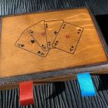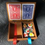 Dieses elegante Holzetui dient zur Aufbewahrung von Kartenspielen. Es gibt daran keinerlei Hinweise, die auf ein so raffiniertes Trickgerät schliessen lassen, mit dem gleich drei verschiedene Effekte möglich sind.