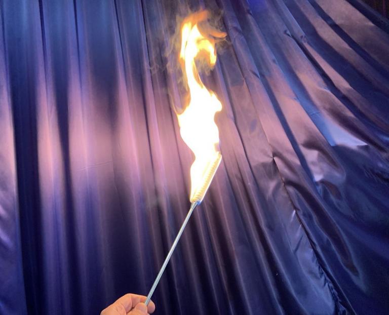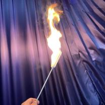 Eine etwa 38 cm grosse hochlodernd brennende Metallfackel verwandelt sich blitzschnell in einen langen Metallstock, den Sie dann spielerisch zwischen Ihren Händen drehen können. Selbstverständlich können Sie auch nur den erscheinenden Stock vorführen, denn die Fackel ist abtrennbar. Ein idealer Eröffnungstrick, der sowohl für die Bühne als auch für die Vorführung im Freien bestens geeignet ist. Die Fackel ist nicht gewickelt, so dass es keinen Verschleiss am Dochtband gibt.