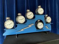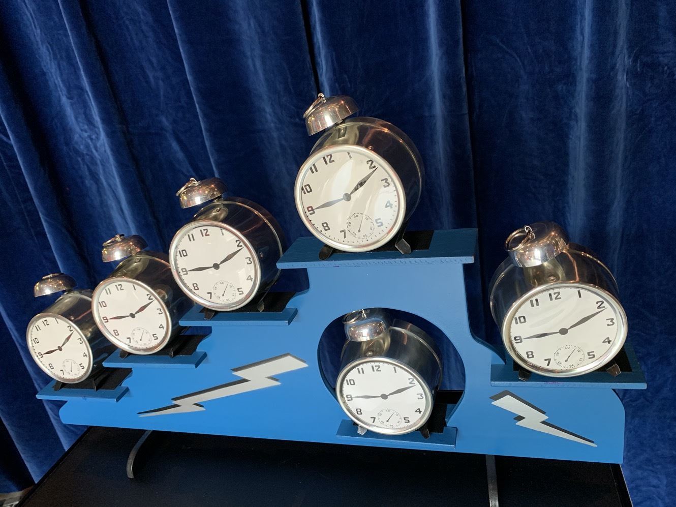 Ein Kunststück ersten Ranges! Mit diesem Requisit sind Sie in der Lage, aus Produktionsgeräten (z.B. unserem SUPER-SILK oder KLAPPZYLINDER 6 Stück läutende Wecker-Uhren hervorzuzaubern! Die Wecker läuten in unterschiedlichen Tonhöhen und werden auf eine dekorative Unterlage abgestellt. Ein echtes EVERGREEN der Magie!