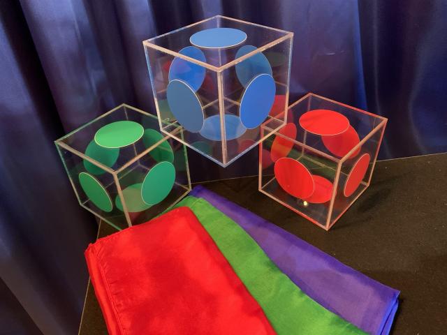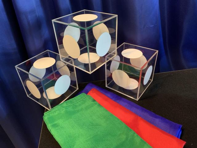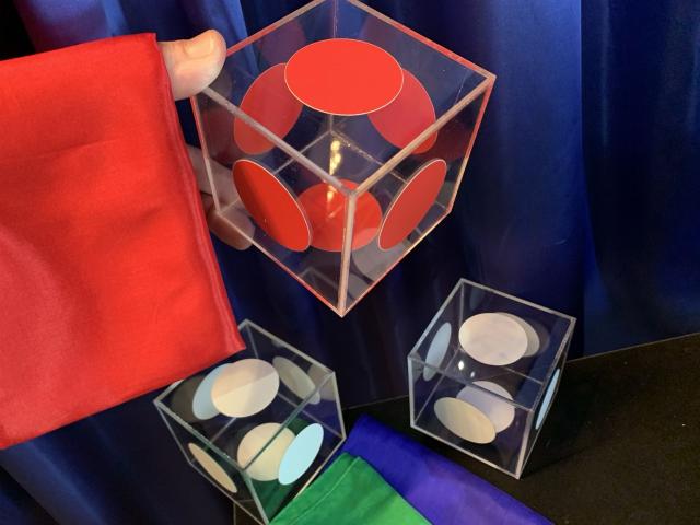 Das ist Zukunftszauberei mit modernsten Requisiten: Zauberei mit Plexiglas. Der Zauberkünstler hat auf seinem Tischchen drei glasklare Plexiwürfel, mit weissen Punkten auf allen Flächen. Er zeigt den Plexiwürfel mit den grossen weissen Punkten, deutlich vor. Ein rotes Seidentuch wird üben den Würfel gegeben und schon haben sich die weissen Punkte ROT gefärbt. Man kann deutlich sehen, dass ALLE SEITEN ROTE PUNKTE HABEN. Mit den zwei anderen Plexiwürfel folgt der Vorführende gleich wie mit dem ersten Würfel. Der zweite Würfel verwandelt sich von weiss in grün und der dritte von weiss in blau. Das ist sichtbare Zauberei wie es von Ihrem Publikum gern gesehen wird. Schön ist der Effekt auch, wenn man es synchron mit einer Partnerin vorführt.