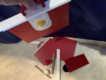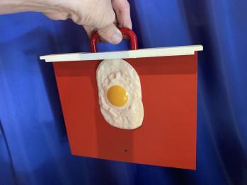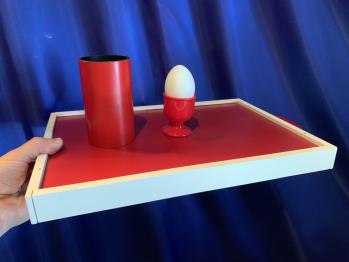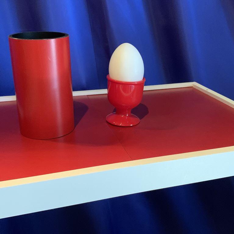Ein Zuschauer wird gebeten ein Tablett zu halten. Darauf steht ein Eierbecher mit einem Ei. Nun versuchen Sie, das Ei verschwinden zu lassen. Aber es will nicht gelingen. Einmal erscheint das Ei am Rücken (!) des Zuschauers, dann plötzlich unten am Tablett. Bei letzten Versuch gelingt der Trick endlich. Doch da zerfällt das Tablett des Zuschauers mit lautem Getöse in seine Einzelteile. Der verdatterte Zuschauer hält nun ein Spiegelei in seinen Händen! Mit Worten können wir Ihnen hier nicht schildern, wie lustig dieser Trick ist. Lassen Sie sich überraschen. Wir liefern Ihnen den Trick mit allem Zubehör (sogar mit Spiegel-Ei!) und einer mehrseitigen ausführlichen deutschen Anleitung.
