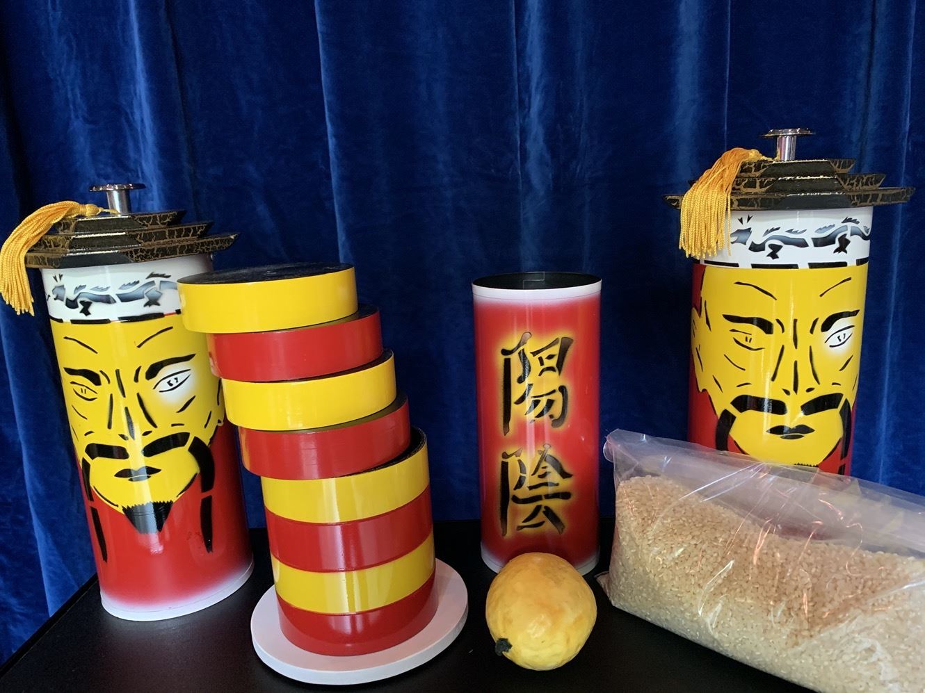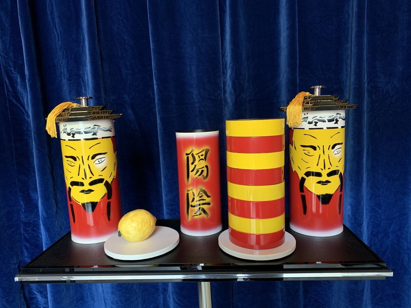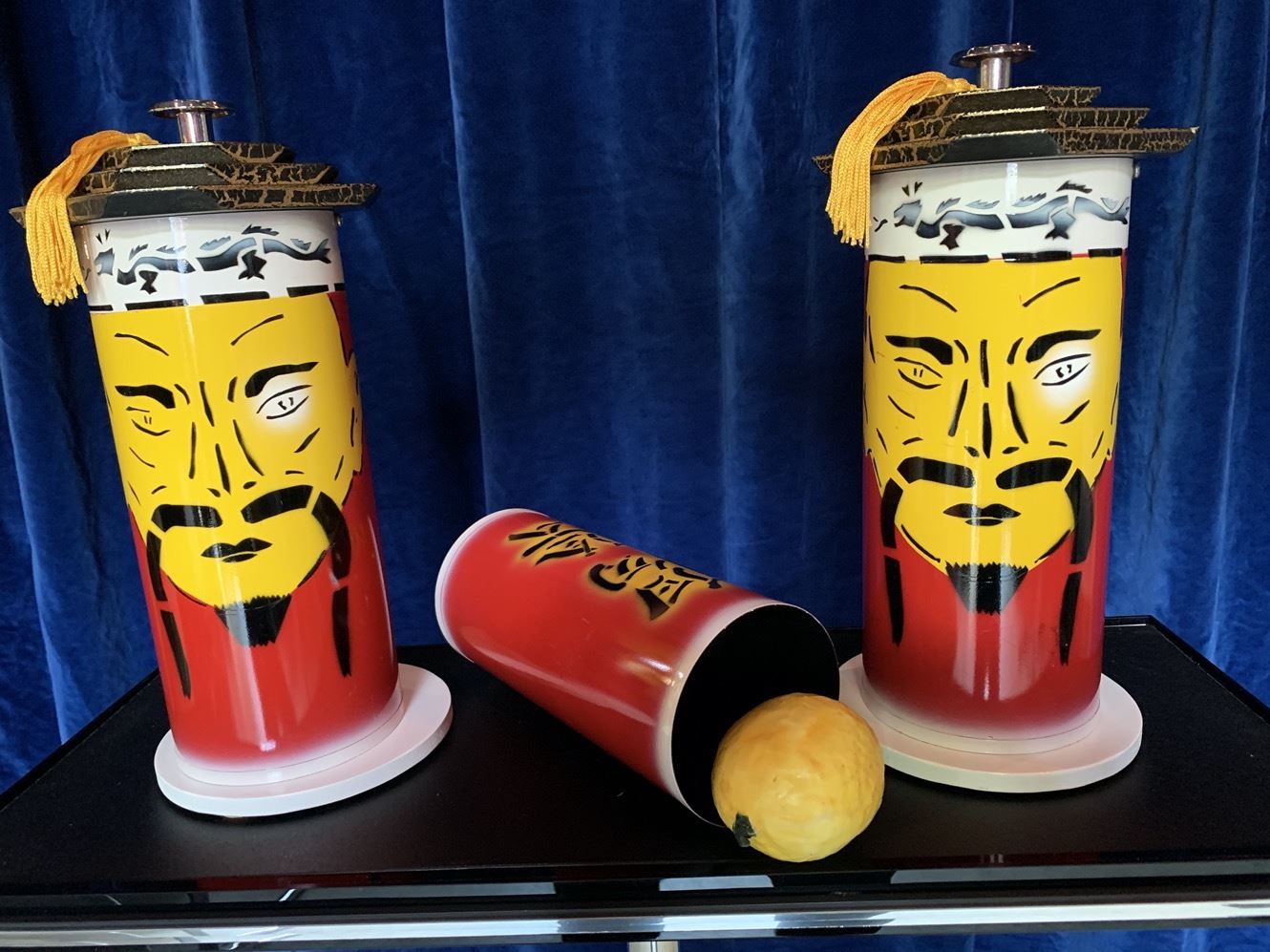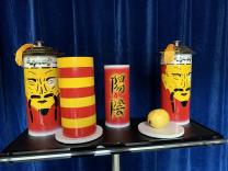 Auf einem Tisch befindet sich ein Stapel runder Plättchen in den Farben gelb und rot, ausserdem eine Orange und etwas Reis. Die Plättchen werden mit einer prächtigen Röhre (China Design) bedeckt. Die Orange kommt unter eine zweite, gleichartige Röhre und der Reis gelangt in einen dritten Behälter. Auf Ihr Kommando findet nun die Sensation statt: Dort, wo vorher die Plättchen waren, fliesst der Reis aus der Röhre. Anstelle der Orange erscheinen die Plättchen unter der zweiten Röhre, und im dritten Behälter hat sich der Reis in die Orange verwandelt. Die drei Gegenstände sind also auf perfekte Art und Weise GEWANDERT!