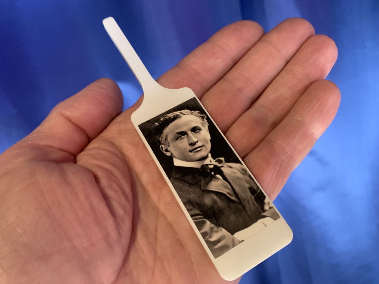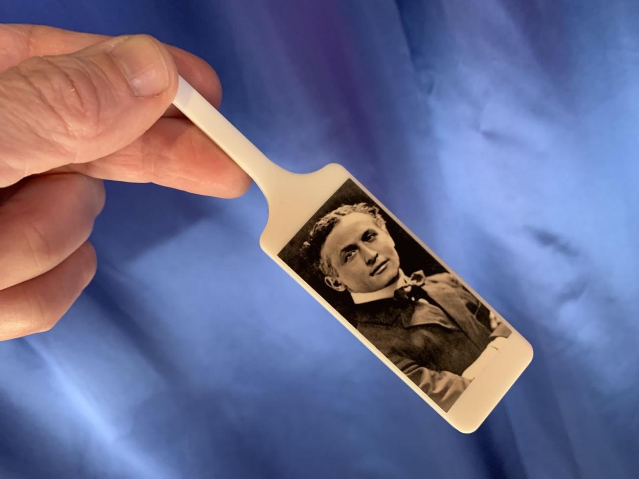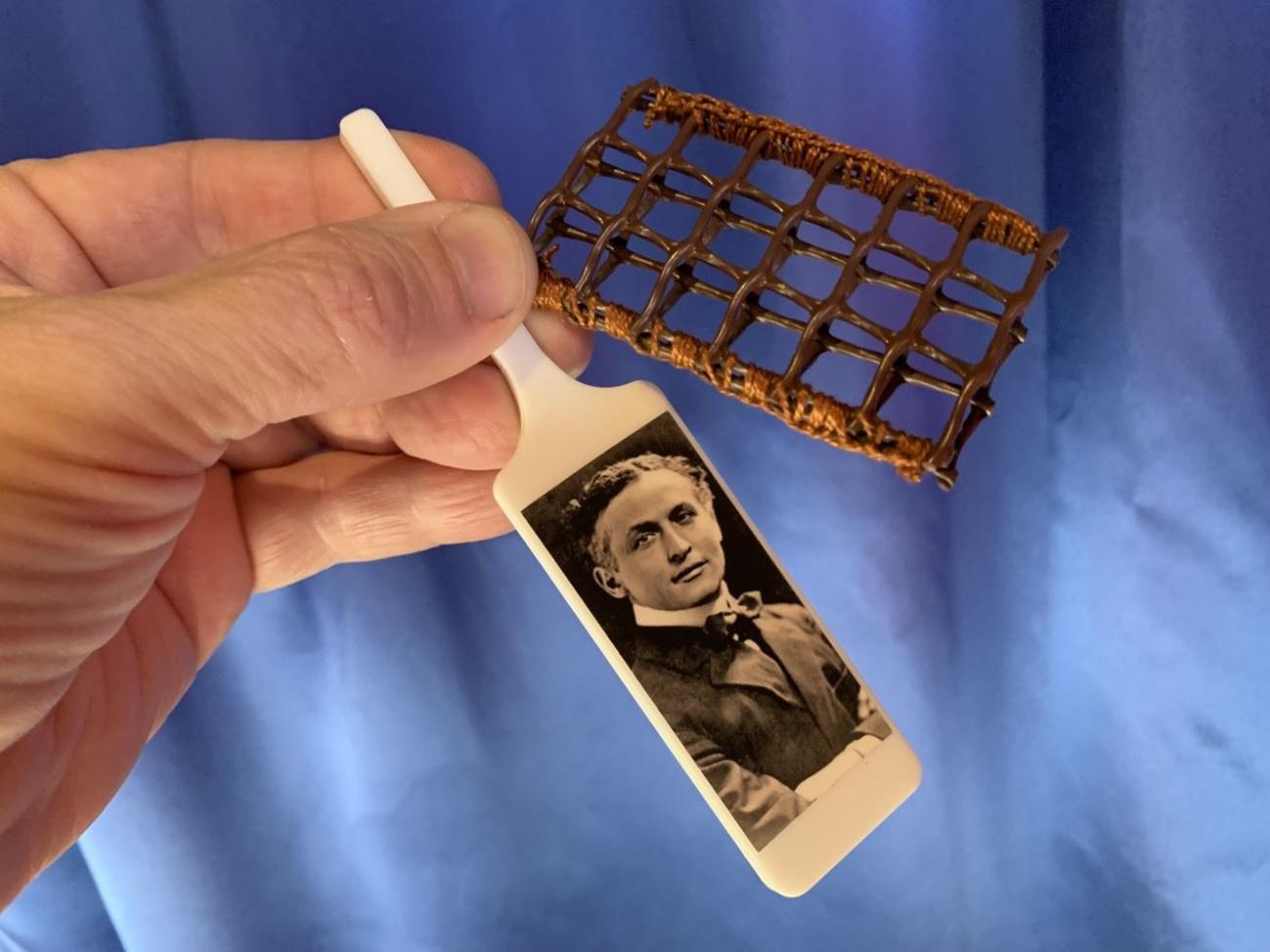 Danach zeigen Sie eine zweite weisse Kelle. Darauf ist auf beiden Seiten der bekannte Entfesselungskünstler Houdini abgebildet. Jetzt wird ein Gitter, das "Gefängnis", über Houdini gestülpt. Dieser ist einwandfrei von beiden Seiten durch die Gitterstäbe zu sehen! HOKUSPOKUS … Houdini ist plötzlich aus dem Gefängnis verschwunden und auf beiden Seiten der Kelle ist nur noch das leere "Gefängnis" zu sehen.