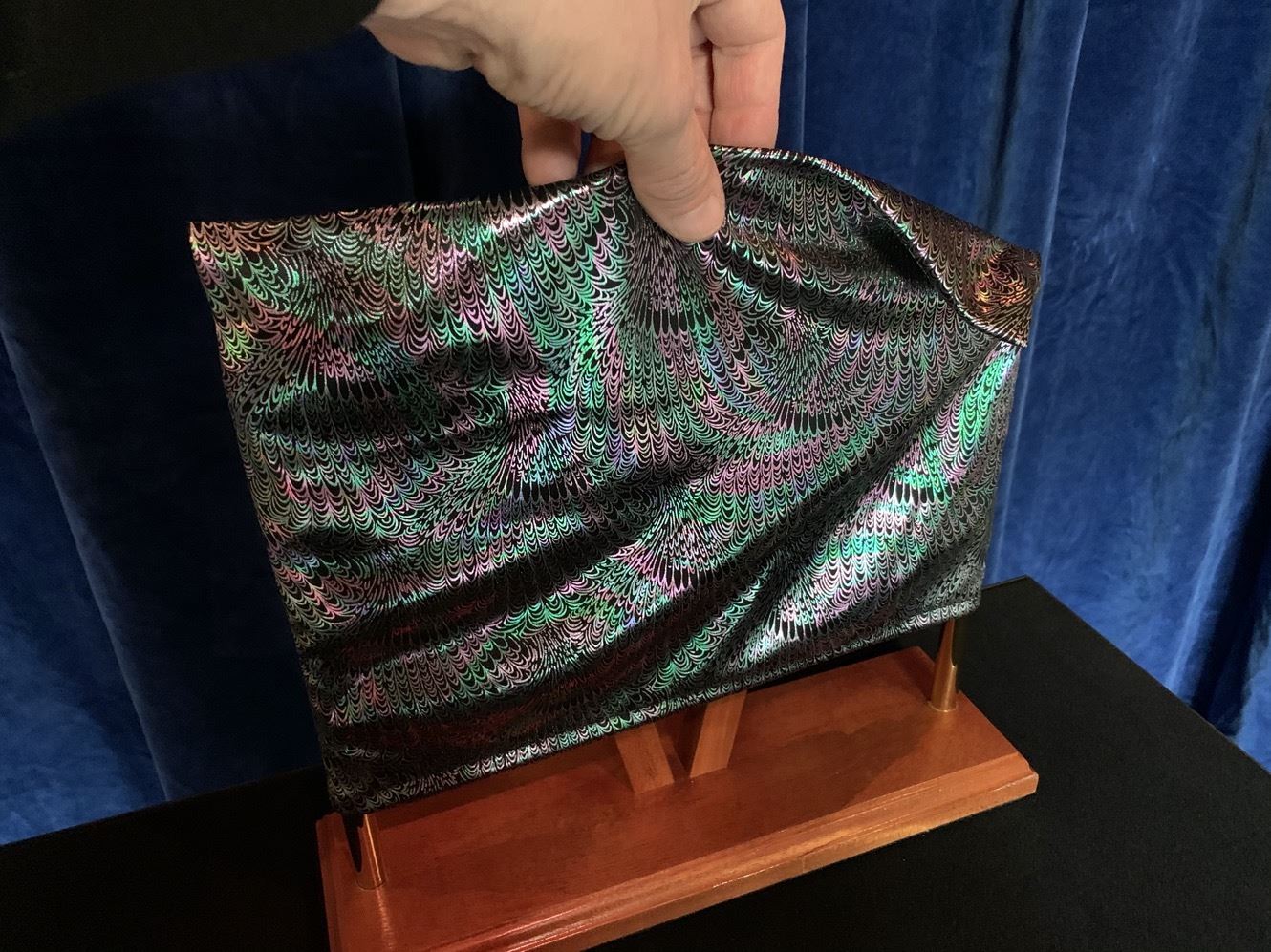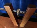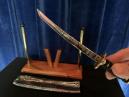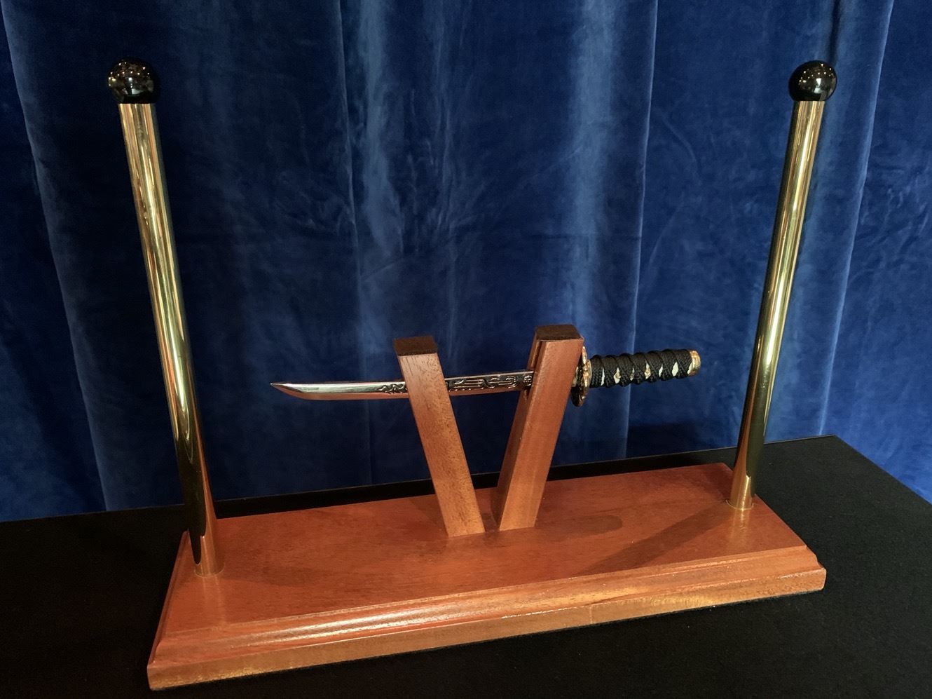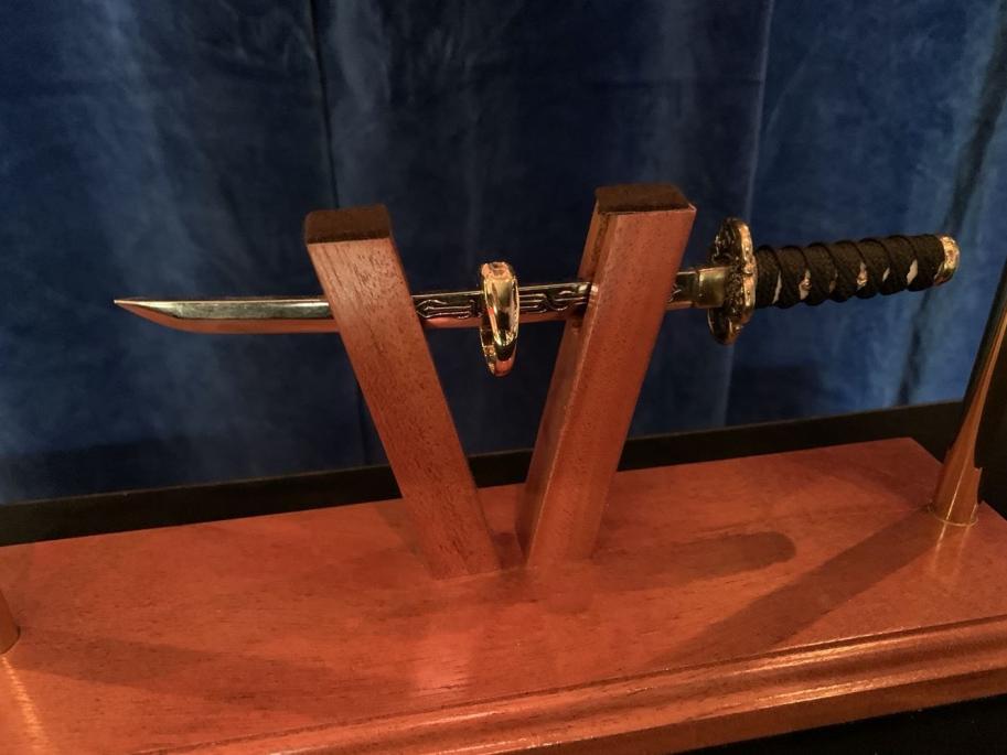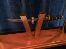 Sie schieben ein kleines Samurai-Schwert durch die seitlichen Öffnungen von zwei auf einer Plattform V-förmig angeordneten Holzpfosten. Anschliessend stülpen Sie einen eleganten Stoffbeutel über die seitlich angebrachten Metallstangen, so dass das Schwert hermetisch von der Aussenwelt abgeschirmt ist.