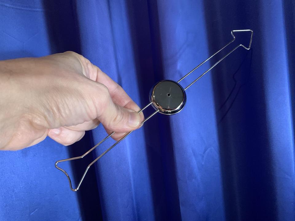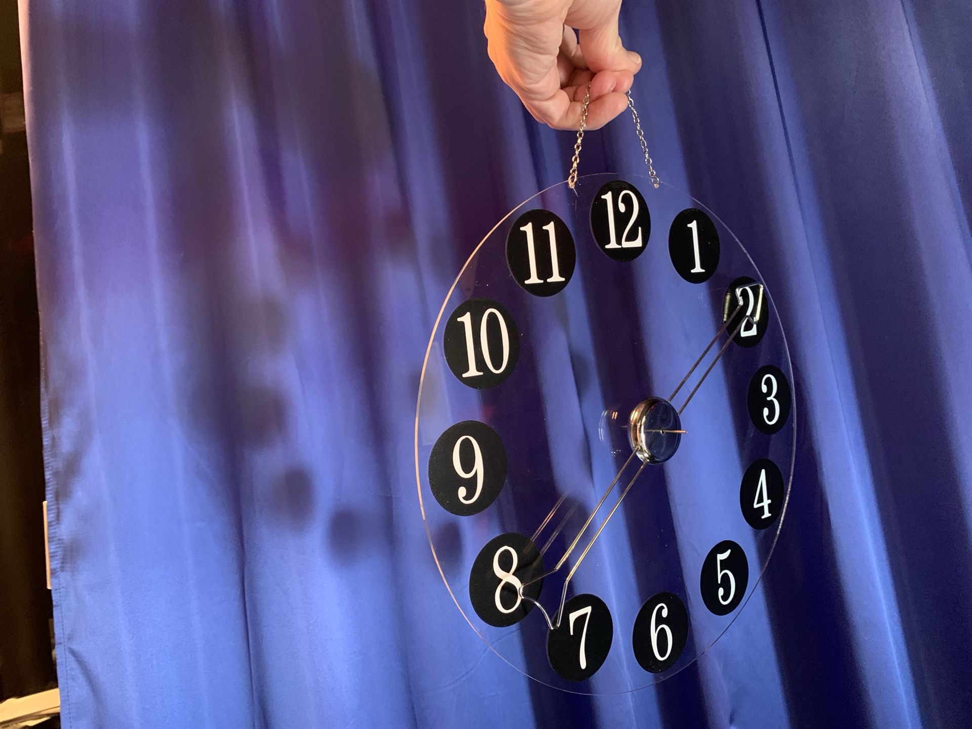 Sie nehmen den grossen, aus silberfarbigem Draht gebogenen Zeiger von der Uhr und bitten einen Zuschauer, eine beliebige Uhrzeit zu nennen. Dann überreichen Sie ihm den Zeiger mit der Aufforderung, diesen auf die Achse der Uhr zu stecken, kräftig zu rotieren und einige Schritte von der Uhr zurückzutreten.