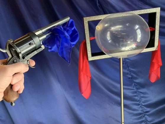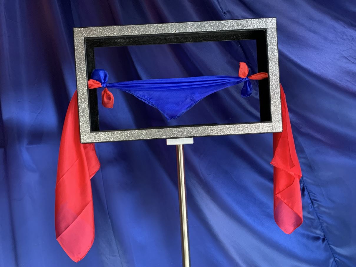 Ein silberglitzernder Rahmen (44 x 25 x 7 cm) bildet die Bühne für einen faszinierenden Effekt: Zwei rote Seidentücher (30 x 30 cm) werden seitlich locker in den Rahmen gesteckt. In der Mitte wird ein aufgeblasener, transparenter Luftballon platziert. Sie lassen ein weiteres Tuch in grün verschwinden und plötzlich erscheint es verknotet zwischen den beiden Tüchern im Rahmen!