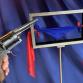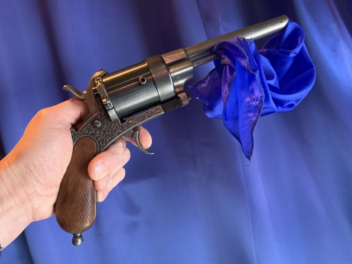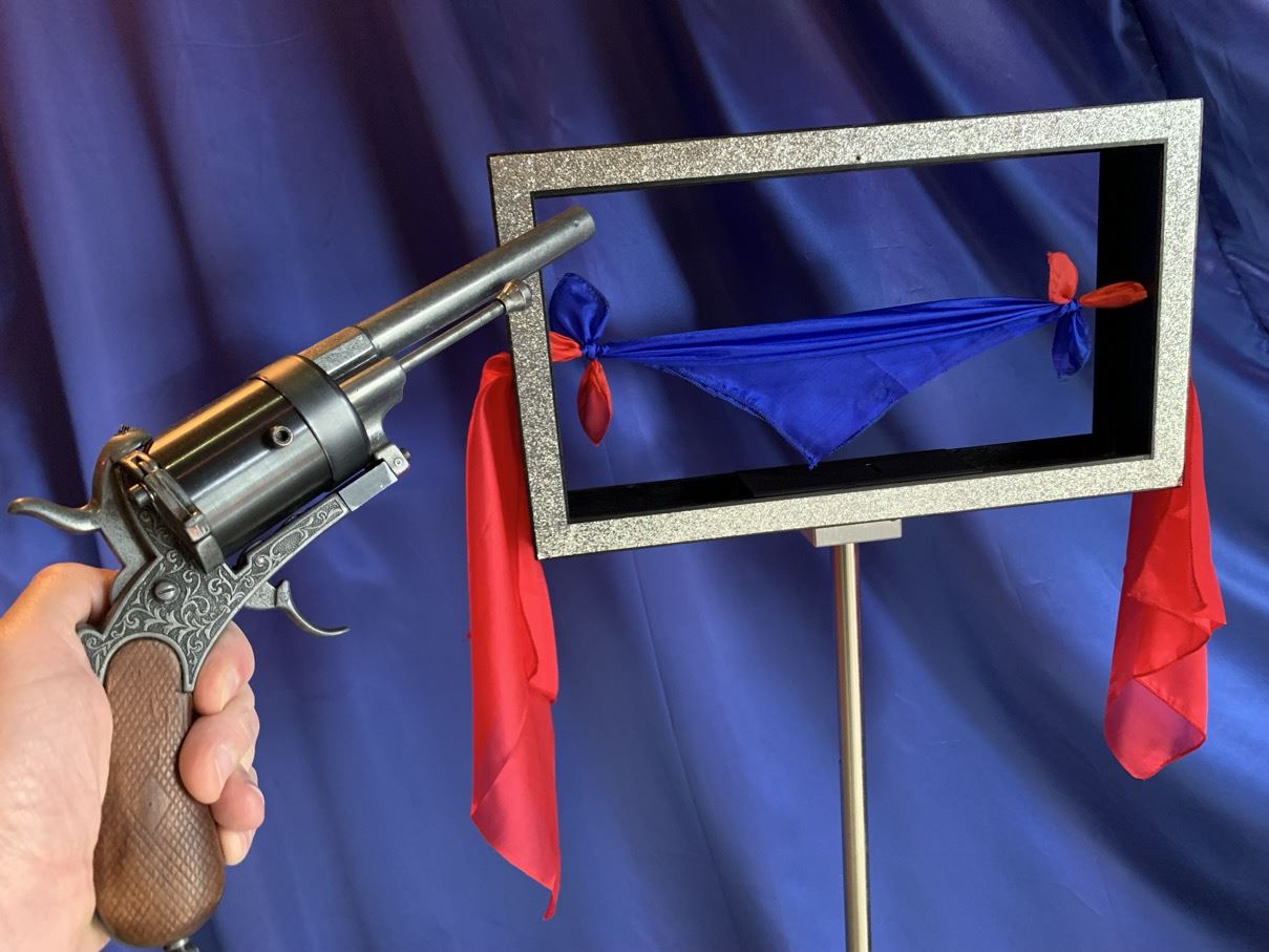 Nun die Neuheit: Der Tuchrahmen funktioniert elektronisch! Mit unserem Tuchrevolver können Sie ein Tuch blitzschnell verschwinden lassen, und wie von Geisterhand erscheint es auf der Bühne im Rahmen. Dank der Elektronik ist dieser Effekt sogar ohne Assistenten vorführbar.