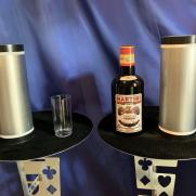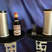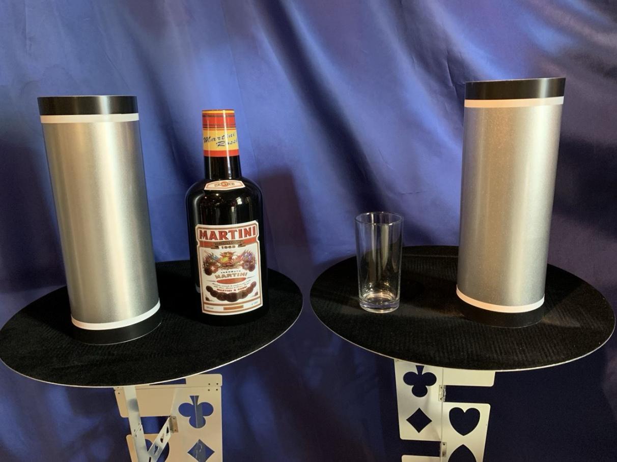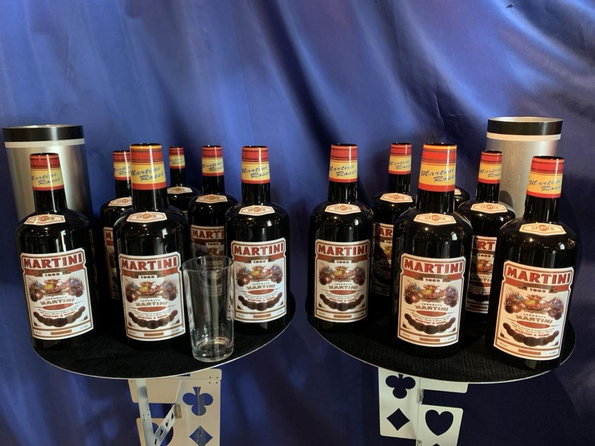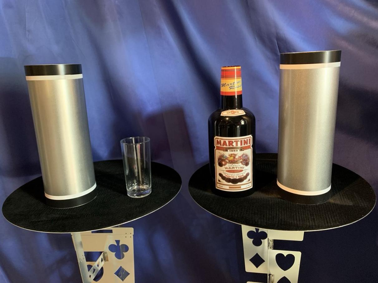Zunächst möchten Sie nur die ganz normale Flaschenwanderung zeigen. Das Publikum sieht eine Flasche Martini, ein gefülltes Glas und zwei Röhren. Sie wollen mit der einen Röhre das Glas bedecken, doch plötzlich sehen Sie, dass auf dem Tisch eine weitere Flasche erschienen ist. "Upps, das ist wohl eine Flasche zu viel", sagen Sie und stellen sie beiseite. Erzählen Sie den Zuschauern, Sie würden nun versuchen, dass Flasche und Glas ihren Platz tauschen. Hierzu bedecken Sie die beiden Gegenstände mit den Röhren und machen über beide eine magische Bewegung. Dann heben Sie die Röhren ein kleines Stück an (aber so, dass die Zuschauer den Inhalt nicht sehen können) und sagen "Super, das hat ja wunderbar geklappt." "Doch nun kommt das Schwierigste: Glas und Flasche müssen wieder den Platz tauschen." Sie machen erneut eine magische Bewegung über den Röhren, heben sie hoch und fangen breit an zu grinsen. Natürlich ist rein gar nichts passiert, was die Zuschauer Sie auch wissen lassen. Sie schauen verdutzt und sagen "Ich glaube das war zu schnell für Sie. Aber das macht nichts, ich zeige es Ihnen gerne noch einmal." Sie stülpen wieder die Röhren über Glas und Flasche und machen erneut Ihre magische Geste. Dann heben Sie die Röhren hoch und nun haben Glas und Flasche tatsächlich den Platz getauscht. "Jetzt brauche ich einen Drink", sagen Sie und leeren das Glas in einem Zug. "Ich zeige es Ihnen noch einmal", erklären Sie den Zuschauern. Doch als Sie eine der Röhren hochheben, erscheint eine neue Flasche, und von nun an können Sie machen was Sie wollen. Jedes Mal wenn Sie die Röhren hochheben kommt eine neue Flasche zum Vorschein, bis zum Schluss 12 Flaschen erschienen sind. Die Flaschenvermehrung bietet einen sehr hohen Unterhaltungswert, und richtig vorgeführt ist sie ein wahrer Knaller, über den Ihr Publikum noch lange reden wird. Auch für Comedy-Zauberer ist sie die richtige Wahl. Wir liefern Ihnen die 12 Trickflaschen und die genau bebilderte Gebrauchsanleitung.