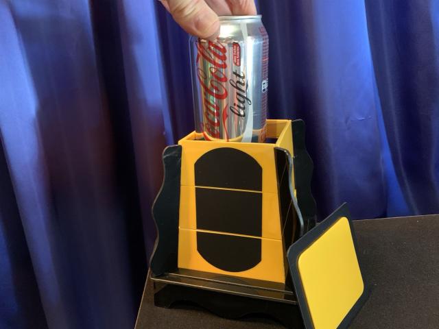 Eine originale Coca-Cola- oder Bierdose wird in einen attraktiv dekorierten Behälter aus schwarzem Acrylglas gestellt. Dieser wird anschliessend mit zwei von den Zuschauern untersuchten Metallplatten in drei Teile zerlegt. Der mittlere Teil kann sogar seitlich herausgeschoben werden – ganz wie bei der grossen ZIG-ZAG GIRL ILLUSION.