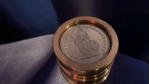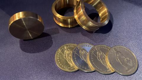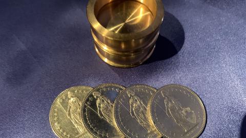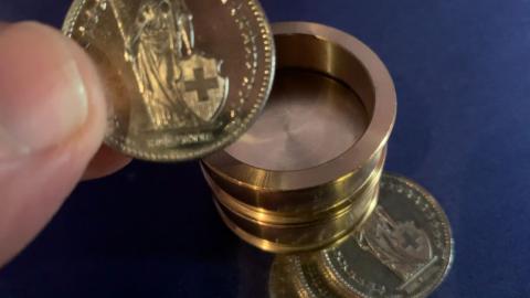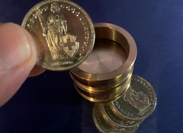 Sie entleihen sich vier 2-Franken-Münzen. Wer will, kann die Münzen untersuchen. Als Nächstes geben Sie zwei Messingringe aus der Hand mit der Bitte um Prüfung. Diese beiden Röhrchen aus Metall können zusammen-gesteckt werden. Dazwischen geben Sie einen massiven Messingring, so dass sich nun in der Mitte ein Boden befindet. Wieder kann alles untersucht werden. Sie werfen jetzt von oben die Münzen in das Röhrchen, und schon durchdringt eine Münze den massiven Messingring und fällt unten aus dem Röhrchen heraus. Mit den verbliebenen drei Münzen wird alles genauso wiederholt. Die letzte Münze stecken Sie sichtbar in die Tasche. Und trotzdem – ohne dass Sie dem Röhrchen nahekommen – wandert diese Münze zum Röhrchen und fällt sichtbar auf den Tisch. Das war schon gut, doch der Abschlusseffekt kommt noch! Sie fragen die Zuschauer, ob sie wissen, wie der Trick funktioniert. Mit den Worten 'Mit einer Batterie natürlich!' rutscht im gleichen Moment aus dem gerade noch leeren Röhrchen eine Batterie auf den Tisch. Es geht natürlich nicht mit einer Batterie, aber es ist der absolute Abschlusseffekt!