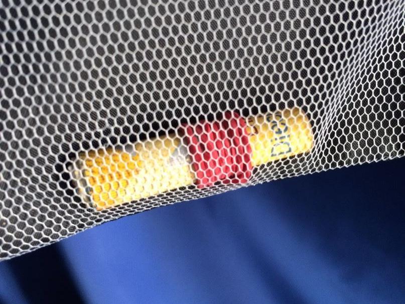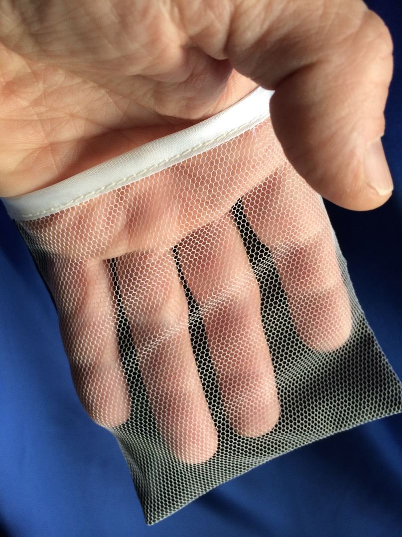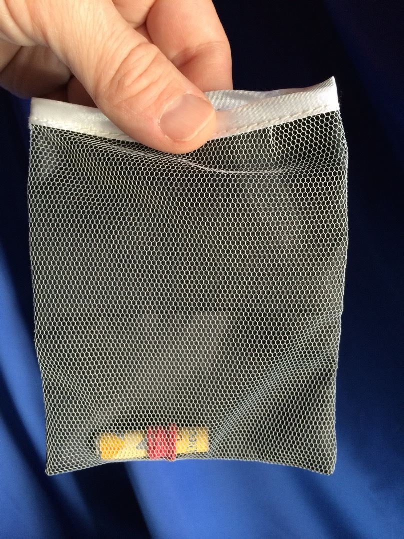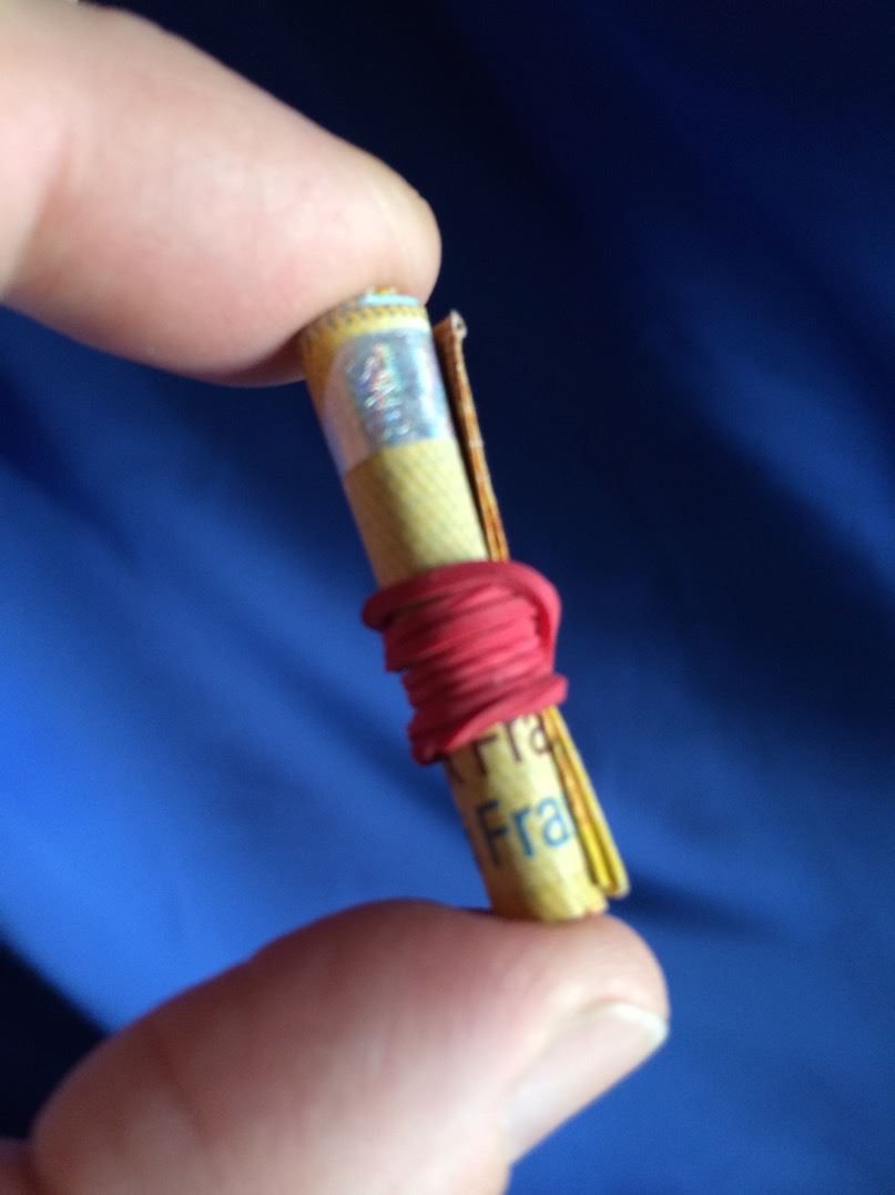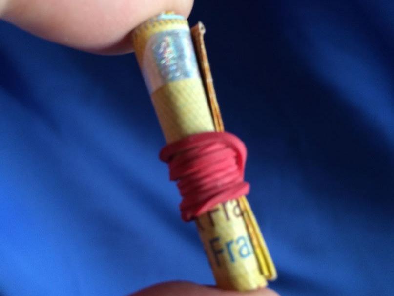 Falten Sie den Hunterter, und rollen Sie ihn zusammen wie ein Lotterielos. Drumherum kommt noch ein kleiner Gummiring. Sie zeigen einer Assisitentin aus dem Publikum ein kleiner Netzbeutel, darin kommt nun der Hunderter. Die Zuschauerin hält den Beutel fest. Der markierte Hunderter bleibt durch das Netz im Beutel währen der ganzen Vorführung immer sichtbar! Und die Assistentin bestätigt es Ihnen und dem Publikum, dass sie beides hält.