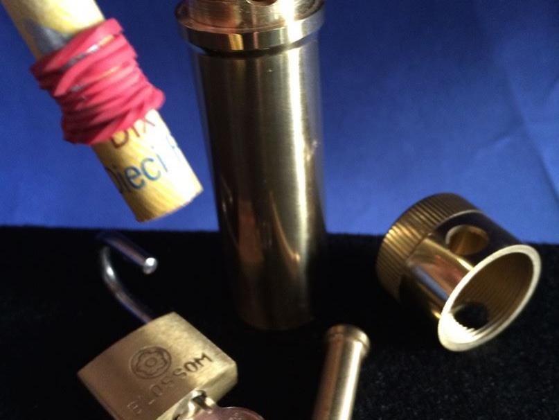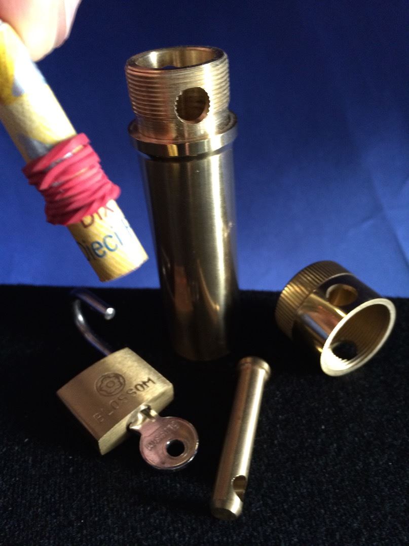 Wir liefern Ihnen alles Komplett: Die "BILL-TUBE DE LUXE" mit Bolzen und Vorhängeschloss und einem sehr schönen Netzbeutel um den Geldschein verschwinden zu lassen und einer ausführlichen Beschreibung. Die "BILL-TUBE DE LUXE" ein sensationelles Zauberkunststück in den Händen des Magiers, der die Sache so richtig zu "verkaufen" versteht.