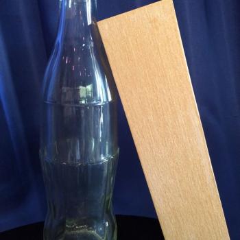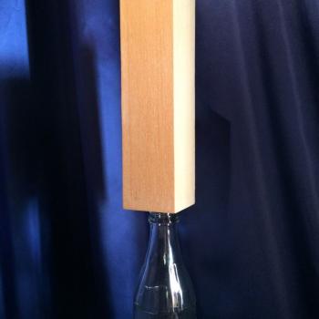 Sind die Geister erst einmal geweckt, sind sie auch in der Lage, Schwierigeres zu vollbringen. Stellen Sie dazu den Holzblock schräg gegen die Flasche, beschwören Sie die Geister abermals aus einiger Entfer- nung und so unglaublich es scheinen mag stösst sich der Block ohne ersichtlichen Grund von der Flasche ab und fällt in die entgegengesetzte Richtung um.