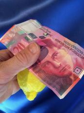 Eine unterschriebene Banknote erscheint in einer frei gewählten Frucht! Ein ganz einfaches und neues Kunststück! Es kann von Ihnen innert 10 Minuten ohne heimliches Getue vorgeführt werden! Sie lassen sich einen Geldschein geben, der vom Besitzer unterschrieben wurde. Der Geldschein wird zusammengefaltet und ist plötzlich verschwunden Ihre Hände sind leer. Nun machen Sie auf einen Obstkorb aufmerksam und bitten den Zuschauer, eine Frucht z.B. eine Orange frei zu wählen und genau anzuschauen. Sie nehmen dann die unpräparierte Frucht und schneiden sie auf, und darin befindet sich der gekennzeichnete Geldschein des Zuschauers! Sie erhalten das Früchtemesser (Länge 30 cm), eine Scheide zu dessen Aufbewahrung, ein weiteres Hilfsmittel sowie eine englischsprachige DVD, auf der alles genau gezeigt wird und eine deutsche Anleitung.