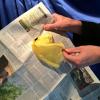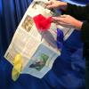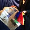 Ein Kunststück mit einer Zeitung. Farbenfroh und besonders visuell ! Der Vorführende zeigt ein Zeitungsblatt einwandfrei von beiden Seiten leer vor (es ist tatsächlich unpräpariert und kann geborgt sein), ebenfalls zeigt er seine Hände leer. Nun durchstösst er mit der einen Hand eine bestimmte Stelle im Bogen, und dort materialisiert sich plötzlich ein Seidentuch! Die Zeitung wird gewendet, man sieht das Tuch von beiden Seiten. Noch an drei weiteren Stellen erscheinen diese auf magische Weise ein Tuch. Am Ende haben Sie 4 Tücher, mit denen sofort weitergezaubert werden kann!