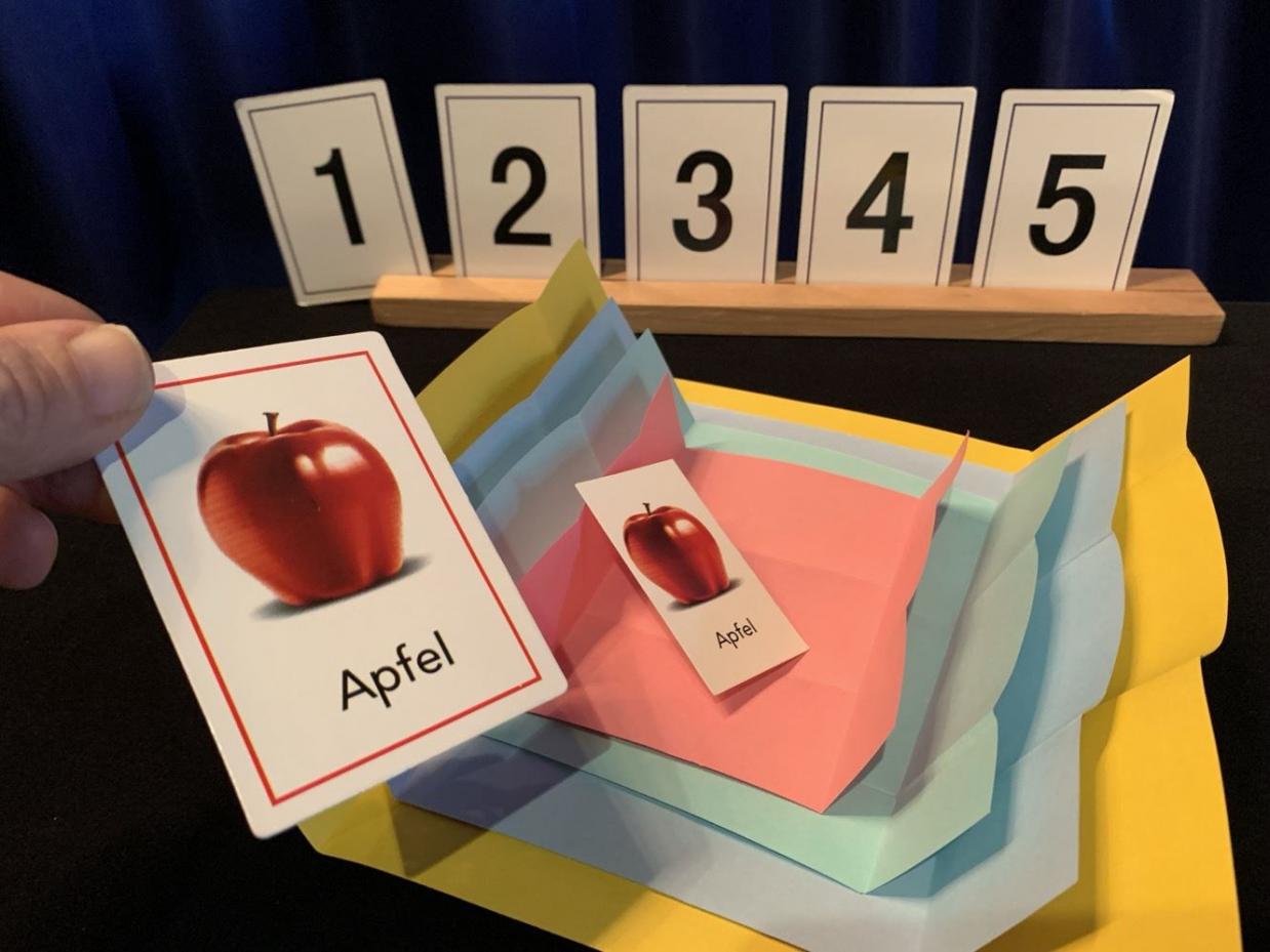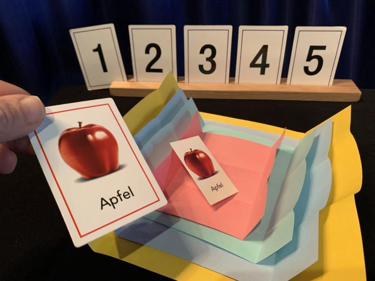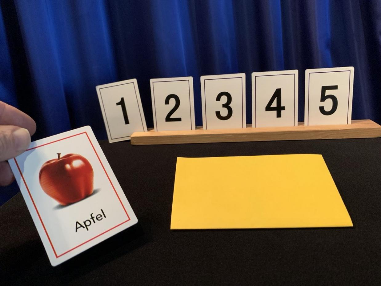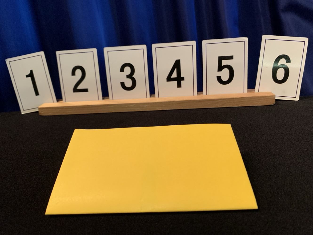Dies ist ein toller und einfach vorzuführender Zaubertrick, der sich gut zum Vorführen am Tisch eignet. Der Zauberkünstler macht Voraussage, die sich in einem Briefumschlag befindet. Danach präsentiert er 6 Karten mit den Zahlen 1-6. Der Zuschauer darf eine Zahl auswählen, z.B. die Zahl 6. Auf der Rückseite seiner Karte befindet sich das Bild eines Apfels.