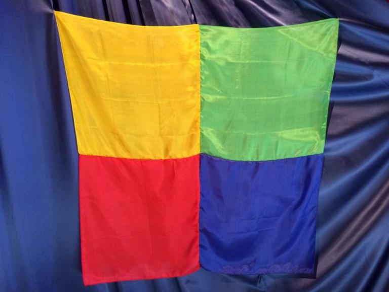 Hier erhalten Sie acht einzelne Seidentücher (Grösse 45 x 45 cm), je zwei in den Farben rot, gelb, grün und blau und ein vier Farben Blendotuch (rot, gelb, grün und blau) in der Grösse 90 x 90 cm