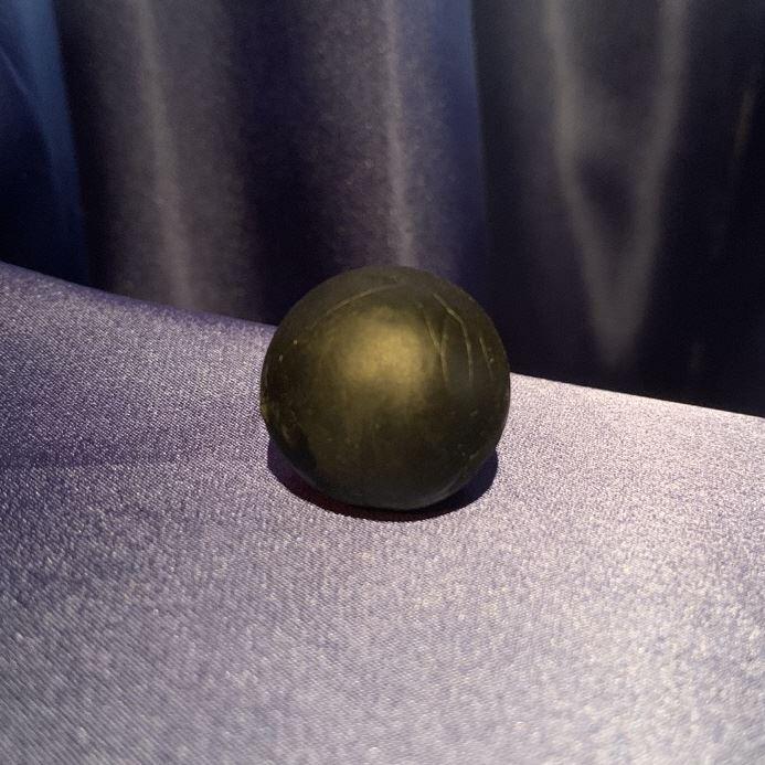 Sie zeigen einen schwarzen Gummiball mit einem Durchmesser von 2,5 cm und jedesmal, wenn Sie ihn auf den Boden fallen lassen, springt er "Pling!" in Ihre Hand zurück .
