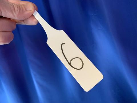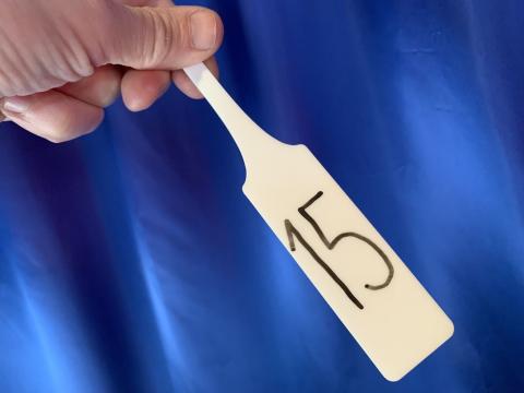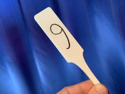 Sie zeigen eine Kelle. Auf der einen Seite steht die Zahl 6 und auf der anderen die Zahl 9.