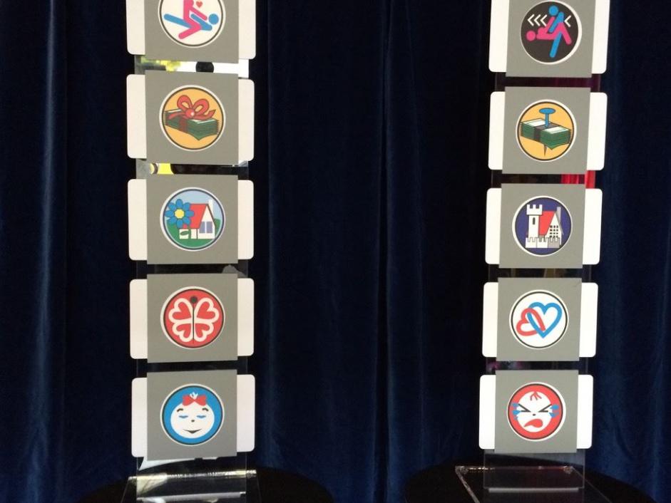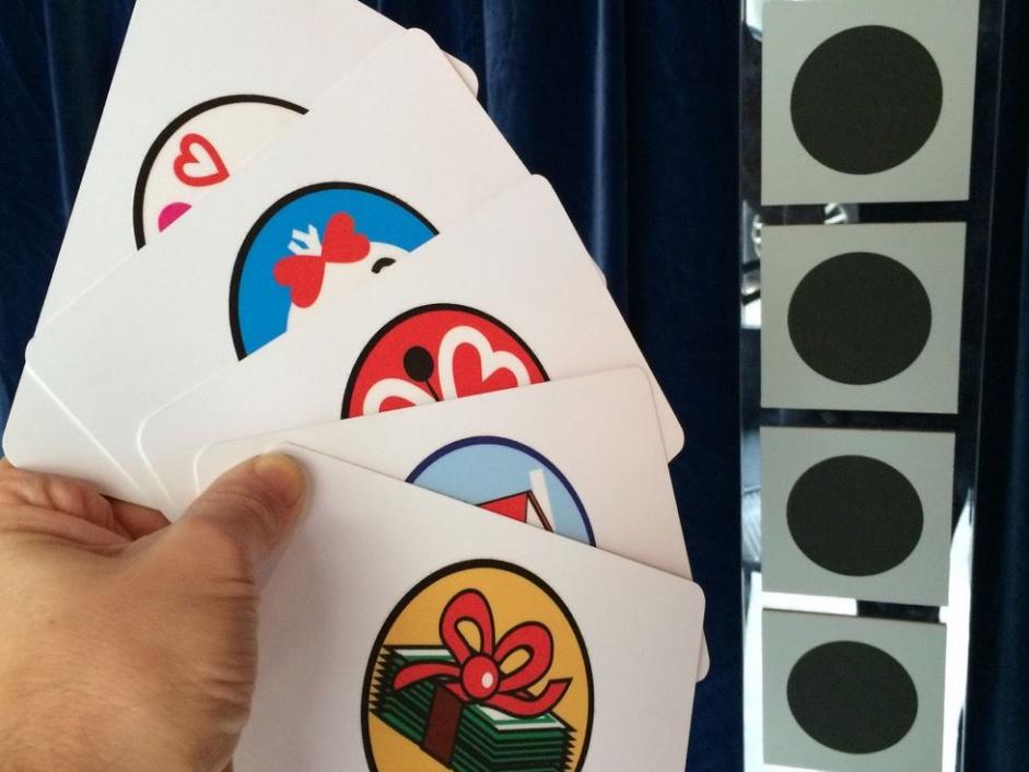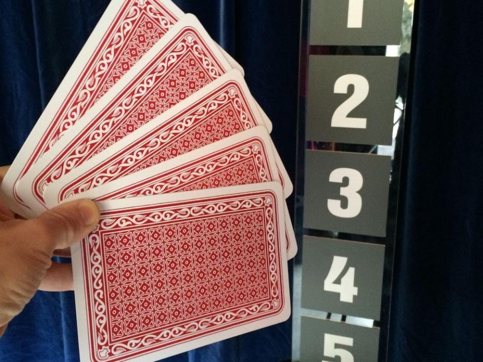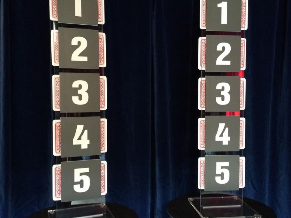 Sie bitten das Hochzeitspaar nach vorn um zu testen, inwieweit ihre Interessen gleich gelagert sind. Braut und Bräutigam erhalten dazu 5 Riesenkarten. Auf jedem Kartensatz sind Abbildungen von typischen Dingen, die sich in der Regel jedes Ehepaar wünscht: Liebe, Haus, Kinder, Sex, Geld. Sie bitten die beiden, die Karten zu mischen und verdeckt zu halten. Ausserdem zeigen Sie dem Publikum zwei leere Halterungen, die in Stativen stecken. Auf der Rückseite sind diese mit den Zahlen 1 bis 5 versehen. Sie nehmen die 5 Karten der Braut und stecken sie mit der Rückseite nach vorn in die erste leere Halterung, und zwar in einer Reihenfolge, welche die Braut selbst bestimmt. Auf die gleiche Weise verfahren Sie mit dem Kartensatz des Bräutigams. Auch er bestimmt die Reihenfolge und wie die Karten angeordnet werden sollen. Werden beide Halterungen umgedreht, stimmen die Karten- sätze vollständig überein. Ein verblüffendes Ergebnis! Verwechseln Sie dieses Kunststück nicht mit den üblichen bekannten ESP-Tafeln. Beachten Sie die Fakten: