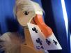 Wir bieten Ihnen hier eine Kartenente in Spitzenausführung an. Durch ihren hohen Unterhaltungswert ist sie aus vielen Programmen nicht wegzudenken. Zwei bis drei Karten werden von Zuschauern völlig frei (!) gezogen und anschliessend zurück ins Spiel gemischt. Das Spiel geben Sie dann in ein Holzkästchen vor der Ente. Nach einigem Hin und Her (sie sträubt sich ein wenig, beisst Ihnen in den Finger usw.) schnellt HELGAS Schnabel vor und zieht eine der Zuschauerkarten aus dem Spiel. Nun wird es schwieriger. Der Ente werden die Augen verbunden, und sie kann nichts mehr sehen. Doch ohne Schwierigkeiten meistert HELGA auch diese Situation und zieht eine weitere richtige Karte aus dem Spiel. Doch es stellt sich heraus: HELGA hat gemogelt! In der Augenbinde befindet sich nämlich an einer Stelle ein Guckloch! Als Stärkung trinkt HELGA dazwischen mit einem Trinkhalm ein Glas Milch man sieht richtig, wie die Flüssigkeit langsam weniger wird! Sie müssen es erlebt haben, welche Kapriolen die Ente vollbringt und wie das Publikum lacht und staunt. Kinder und Erwachsene können bei der Vorführung mitmachen und werden voll in den Handlungsablauf einbezogen. Wir liefern Ihnen die Ente inkl. Spezialaugenbinde, Spezialglas, Kartenspiel sowie einer deutschen Beschreibung mit drei Routinen in einer Transportbox fein säuberlich verpackt.Tip: mit dem Trick: ALTER-ERRATEN kann HELGA auch das Alter erraten von einem Zuschauer! Auch eine Perfekte Verbindung ist: PROFI-MINDSCANNER, HELGA findet das richtige E-S-P Zeichen heraus das der Zuschauer vorher auf den PROFI-MIDSCANNER gezeichnet hat. Die Karten und Requisiten können Sie unten separat dazu bestellen.