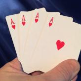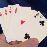 Natürlich steckt er die Klammer auf die Karte, die auf dem Tisch liegt, und nun folgt der irre Abschluss: Sie drehen die Karten in Ihrer Hand herum, und dort sind die schwarzen Karten verschwunden. Stattdessen halten Sie nur noch Herz Asse in der Hand.