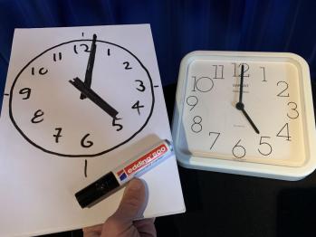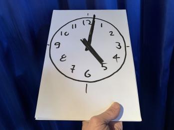Auf einem gewöhnlichen Schreibblock zeichnen Sie mit einem dicken Filzstift das Zifferblatt einer Uhr, zeigen den Zuschauern aber nicht, welche Zeit Sie darauf eingegeben haben. Dann erklären Sie ihnen, dass für die meisten Personen im Leben eine bestimmte Uhrzeit eine ganz besondere Bedeutung hat. Eine solche Person findet sich dann auch. Sie übergeben ihr eine einfache Küchenuhr, auf der sie ihre besondere Zeit einstellen soll, und gehen zu Ihrem Schreibblock zurück. Zuerst zeigen Sie dem Publikum, was Sie eingezeichnet haben. Erst darauf (!) zeigt die Person ihre eigene Zeit auf der Küchenuhr. Die beiden Zeiten stimmen überein!!! Vergessen Sie alles, was Sie über Mentalmagie wissen. Das Zifferblatt befindet sich wirklich nur auf dem Schreibblock, und nur die betreffende Person kennt ihre eigene Uhrzeit. Es gibt keine eingeweihten Gehilfen. Dies ist ein echt revolutionärer Mentalhammer! Einzelstück, Rarität 1 A, wird nicht mehr hergestellt!