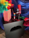 Zuerst ein praktischer Koffer, in dem Sie Ihre Requisiten transportieren, dann ein Knopfdruck und zwei einfache Handgriffe *ZACK* schon haben Sie einen fantastischen Tisch "herbeige- zaubert" und können gleich mit Ihrer Show beginnen. Am Schluss klappen Sie den Tisch wieder zusammen, lassen die Räder verschwinden und gehen von dannen. Auch ideal als Close-up Tisch (Gesamthöhe ca. 70 cm), um Ihre Show sitzend vorzuführen! Ein schönes, praktisches Requisit! Auf der Rückseite haben Sie drei Ablageflächen in 20, 13 und 30 cm Höhe. Aufgebaut beträgt die Gesamthöhe 90 cm und die Breite 60 cm. Geschlossen sind es 60 x 48 x 30 cm. Der Koffer ist schwarz lackiert und mit einem Tragegriff versehen. Auf der Vorderseite können Sie Ihren Namen anbringen. Auch zusammengebaut kann der Koffer