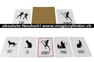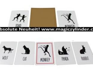 Der Vorführende überreicht einem Zuschauer einen Umschlag mit einer Vorhersage darin. Danach präsentiert der Zauberer sechs Poker Karten mit bedruckten Tieren wie: Hase, Frosch, Katze, Wolf, Panda und Affe. Um ein Tier Auszuwählen wählt der Zuschauer eine Zahl von 1 - 6, sagen wir z.B. 3 das ist der Affe. Das Kuvert wird vom Zuschauer geöffnet und es ertönt ein Geräusch, ein Rascheln! Der Zuschauer erschreckt, und lässt das Couvert fallen, darin ist ein zweites Couvert und darin ist EINE Karte, bedruckt mit einem Affen! War das Rascheln von einem Affen. Super in der Wirkung aber einfach zu erlernenen, komplett mit sehr schön gedruckten Karten und deutscher Beschreibung.