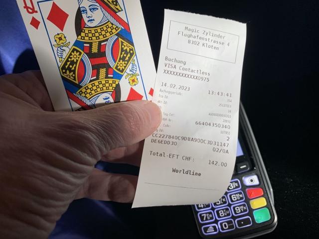 Mit dieser Karte sorgen Sie für Verwunderung an der Kasse. Statt Ihrer EC-Karte legen Sie eine Karte aus Ihrem Kartenspiel auf das EC-Lesegerät! Die Bezahlung wird erfolgreich abgeschlossen, Sie gehen und hinterlassen verdutzte Gesichter! Für die Wirkung auf die umstehenden Personen haben Sie hier einen Effekt zur Hand, bei dem jeder grosse Augen machen wird! An der Supermarktkasse, im Restaurant oder im Bekleidungsgeschäft, stets lautet die Frage "Zahlen Sie bar oder mit Karte?" Daraufhin nehmen Sie eine der Karten aus Ihrem Kartenspiel und halten sie an das EC-Lesegerät. Das Gerät piept, der Datenaustausch läuft und die Bezahlung wird erfolgreich abgeschlossen! Der Kassierer schaut Sie mit grossen Augen an, während der Beleg ausgedruckt wird.