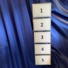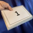 Sie betreten die Bühne und entfalten einen fünfteiligen Leporello. Er hat ein Ausmass von 30 x 105 cm und ist somit auch auf grösseren Bühnen gut sichtbar. Die einzelnen Felder sind von 1 bis 5 durchnummeriert.
