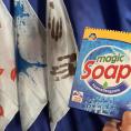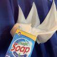 Um die Tücher zu „waschen“, steckt der Magier sie in eine Schachtel mit angeblichem Waschmittel. Als Waschpulver gibt er ein paar Spritzer aus unserem QUITSCHENDEN SALZSTREUER in die Box, und als Weichspüler giesst er etwas Milch aus dem ZAUBER–MILCHGLAS dazu. Er erklärt, der Karton funktioniere wie eine magische Waschmaschine.