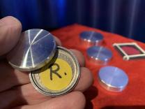 Ein Zuschauer kennzeichnet eine Münze (z.B. einen Zweifränkler) mit einem wasserfesten Filzstift oder einem Klebepunkt, den er zusätzlich noch signiert. Er schliesst dann die Münze zwischen zwei Plastikplättchen mit vier Gummiringen ein. Nun hüllen Sie das Ganze in ein Tuch, das vom Zuschauer gehalten wird. Gleichzeitig bringen Sie eine hübsche, runde, silberne und fest verschlossene Aluminiumdose zum Vorschein und legen sie auf den Tisch. Anschliessend wird das Tuch entfernt und die Zuschauer stellen verblüfft fest, dass die Münze aus den beiden gesicherten Plastikplättchen spurlos verschwunden ist. Sie bitten jetzt den Zuschauer, die Metalldose vorsichtig zu öffnen. Zur allgemeinen Überraschung befindet sich darin eine weitere, kleinere Dose. Wird auch diese geöffnet, erscheint eine dritte und dann noch eine vierte Dose. Darin findet der Zuschauer seine eben verschwundene und gezeichnete Münze. Sie hat also die zwei Plastikplättchen, das Tuch und alle vier Metalldosen durchdrungen und ist in der innersten Dose gelandet! Ein absolutes Wunder und ein Effekt, den Ihre Zuschauer im Gedächtnis behalten werden. Seit vielen Jahren habe ich dieses Kunststück in meinem Programm und werde immer wieder gefragt, wie die Münze bloss in das Innerste von vier Dosen gelangen konnte.