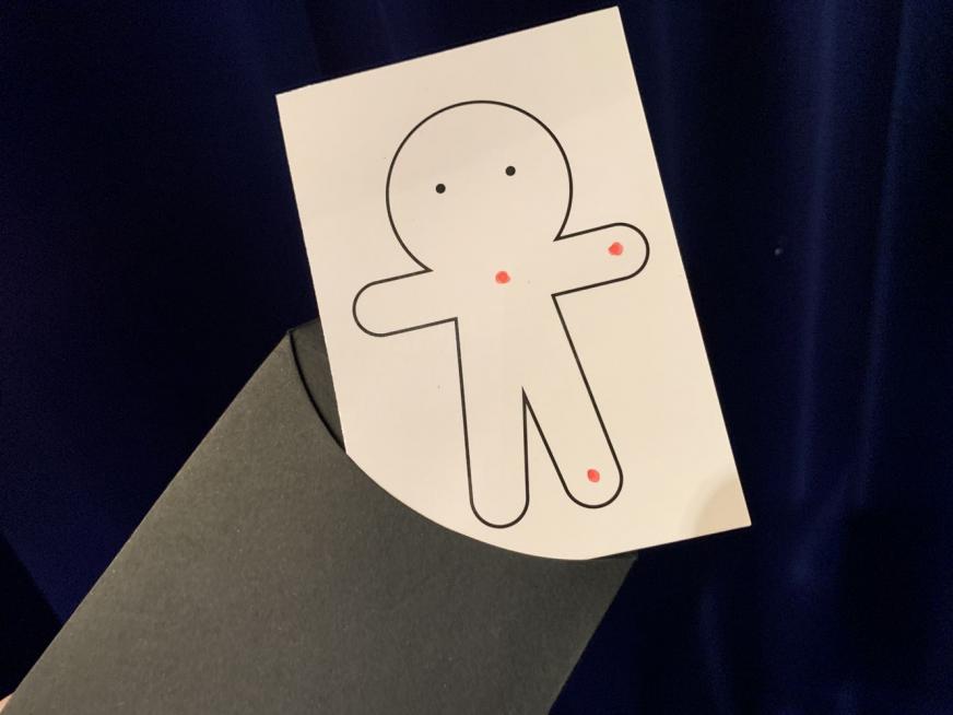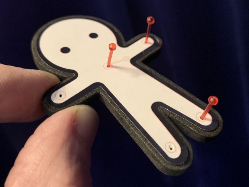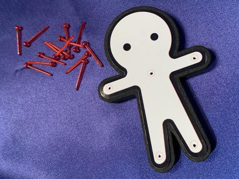 Sie zeigen ein kleines weisses Schaumstoffmännchen (7 cm hoch) mit je einem Einstichloch an den Händen, Füssen und in der Brust. Dann übergeben Sie einem Zuschauer fünf kleine Kunststoffpieker und präsentieren einen schwarzen Umschlag als Vorhersage. Der Zuschauer soll seiner Intuition und seinen Gefühlen freien Lauf lassen und nach eigenem Belieben ein, zwei, drei, vier oder alle 5 Pieker in die Einstichlöcher am Männchen stecken. Dabei kann er seine Entscheidung sooft ändern, wie er möchte. Sobald er sich festgelegt hat, ziehen Sie Ihre Vorhersage aus dem Umschlag. Es kommt die Zeichnung eines kleines Voodoomännchens zum Vorschein, die entsprechend der Wahl des Zuschauers zuvor an den genau gleichen Stellen markiert wurde. Ein sehr cleveres Trick System, ein Trick zum immer dabei haben.