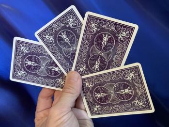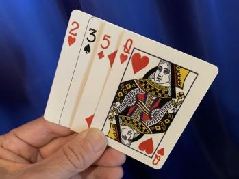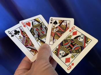 Sie nehmen vier Poker-Karten Herz 2, Pik 3, Karo 5 und eine Herz Dame. Diese vier Karten zeigen Sie Ihrem Publikum, ehe Sie sie einfach auf den Tisch werfen. Unter den wachsamen und völlig verblüfften Augen Ihrer Zuschauer haben sie sich auf wundersame Weise in 4 Damen verwandelt. Selbstverständlich dürfen sie nach der Routine von allen Seiten gezeigt werden.