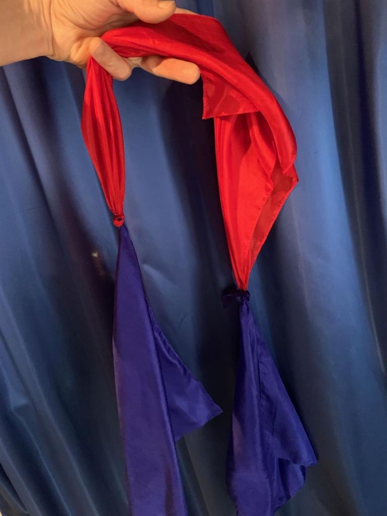 Sie zeigen zwei blaue Seidentücher in der Grösse 5 x 45 cm und knotet sie zusammen. Ein drittes rotes Tuch wird auch gezeigt. Die beiden blauen Tücher kommen nun in ein gewöhnliches Trinkglas und das dritte rote Tuch lassen Sie in Ihrer Hand verschwinden! Werden die blauen Tücher aus dem Glas gezogen, befindet sich das eben verschwundene rote Tuch EINGEKNOTET in der Mitte der beiden anderen Tücher! Ein KLASSIKER der Magie in der besten Ausführung aus reiner Seide. Der Trick wird komplett mit dem Verschwinde Gimmick geliefert.