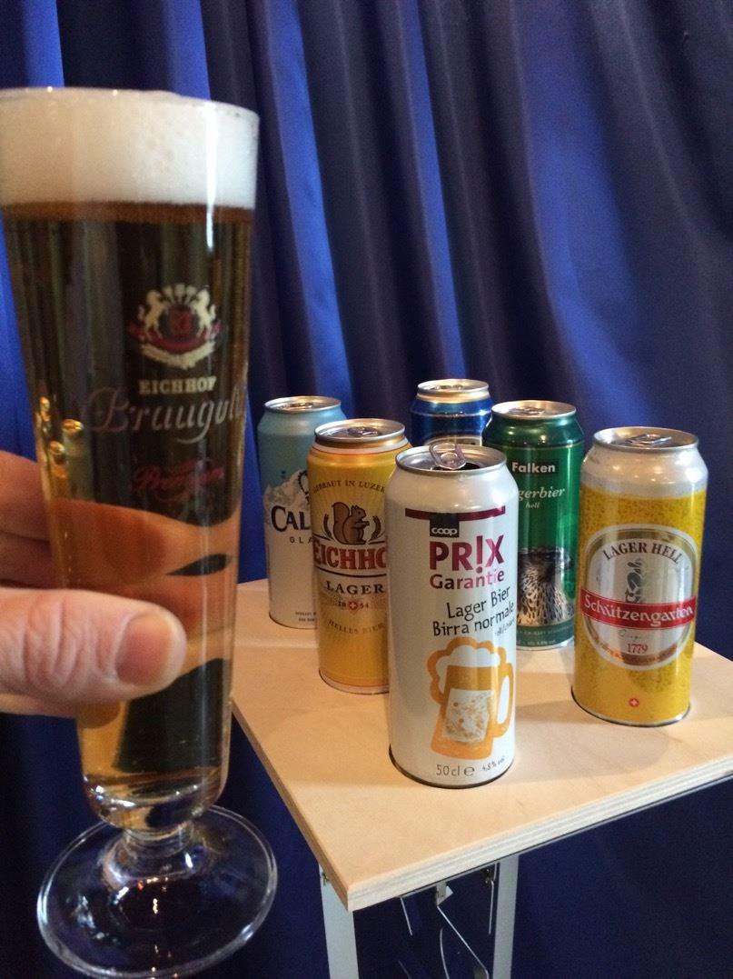 Simsalabim, schon erscheint die zweite Dose "Feldschlösschen" aus Rheinfelden. Natürlich kommen noch weitere Dosen zum Vorschein, und immer ist es eine andere Marke: "Calanda" aus Chur, "Eichhof" aus Luzern, "Falken" aus Schaffhausen und ein Lagerbier "Coop Prix Garantie".