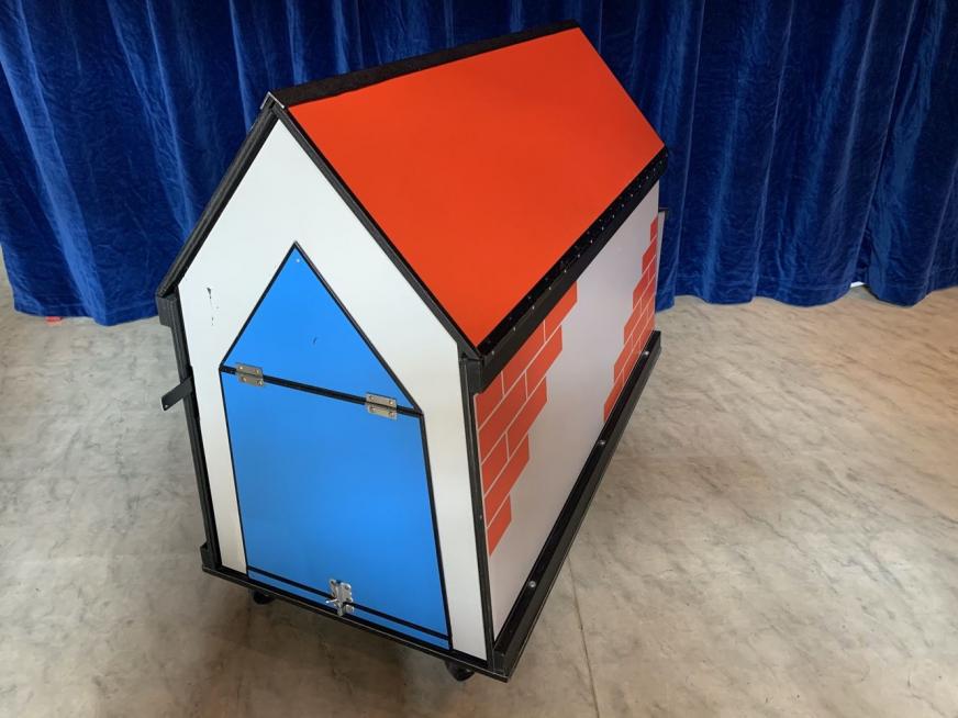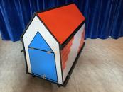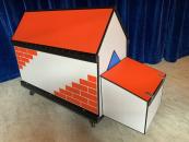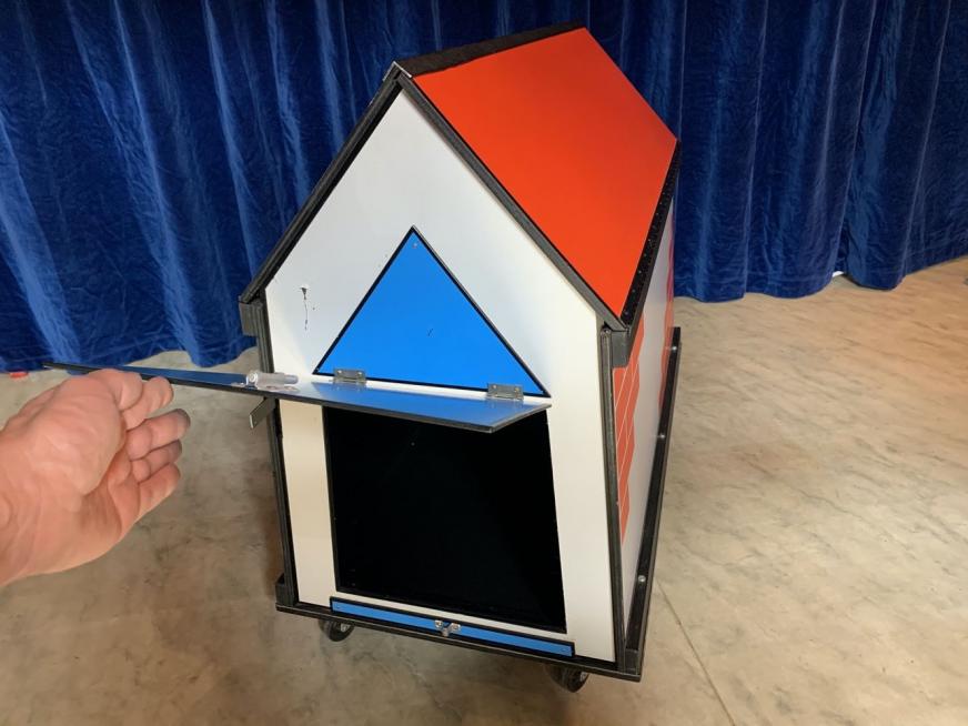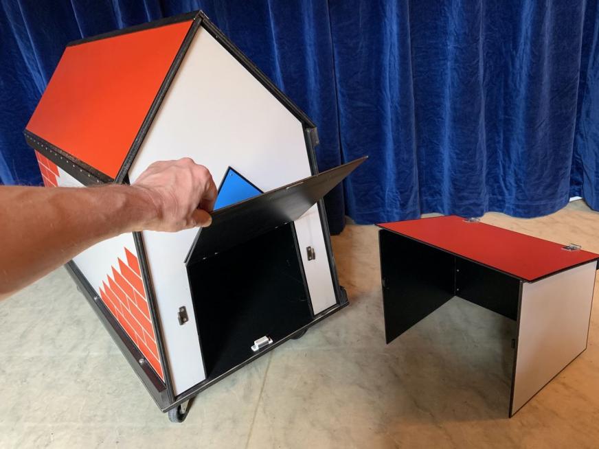 Sie zeigen Ihrem Publikum ein kleines, rollbares Hundehaus (LxBxH: 96x49x79 cm). An der Vorderseite befindet sich ein kleines Türchen. Wenn Sie es öffnen, erscheint eine kleiner Hund oder Sie nehmen eine Spielpuppe heraus . Die Tür bleibt geöffnet, um dem Publikum zu zeigen, dass sich ausser dem Hund bzw. der Puppe nichts im Haus befindet. An der Rückseite ist eine kleine Garage angebracht, die nach dem Leerzeigen weggenommen wird. Sie schliessen dann die Tür und mit einem lauten Knall fällt das Dach auseinander und Ihre Assistentin kommt zum Vorschein! Diese Blitzerscheinung ist so unglaublich, dass Ihrem Publikum der Atem stocken wird.