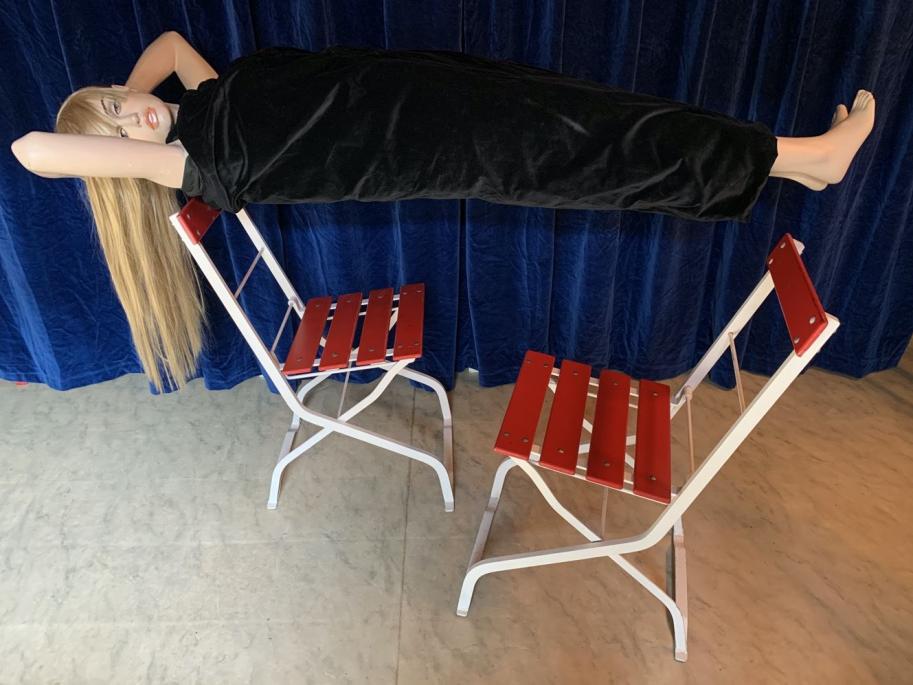 Hier wurde ein superprofessioneller Effekt geschaffen. Ausgehend von der bekannten Stuhlschwebe ist diese Illusion auf kleinstem Raum umringt vorführbar. Sie brauchen nicht einmal eine eigene Assistentin, sondern können fast jede Dame aus dem Publikum nehmen. Nun kommt aber erst der Clou: Obwohl die Dame unpräpariert und uneingeweiht ist, sind Sie in der Lage, das Brett wegzunehmen, auf dem sie liegt. Hier unter-scheidet sich die Illusion von der normalen Stuhlschwebe. Die Dame schwebt wie auf dem Bild ersichtlich völlig frei und ist lediglich mit einem Tuch bedeckt. Sie bauen die Illusion vor dem Publikum auf und anschliessend wieder ab. Die Dame selbst bekommt nichts mit. Ein absolutes Rätsel für jeden Zuschauer! Sie können sich während der Darbietung völlig frei bewegen! Die Entfernung der Zuschauer spielt auch keine Rolle.