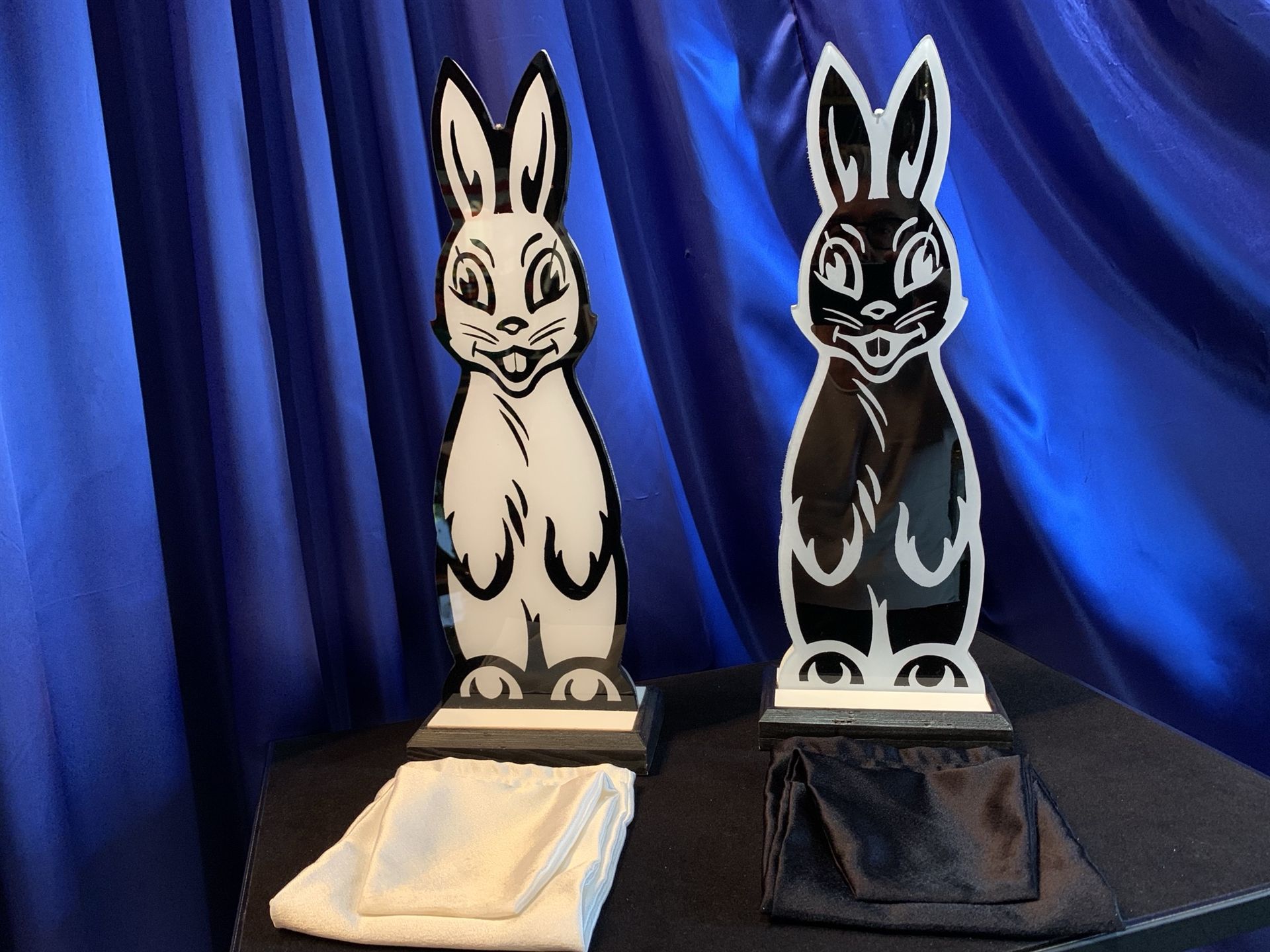 Auf dem Tisch des Vorführenden stehen zwei grosse Hasen: der eine weiss, der andere schwarz. Beide Hasen werden mit Stoffbeuteln bedeckt, der weisse mit einem weissen, der schwarze mit einem schwarzen Beutel. Nun beginnt eine äusserst lustige Hasenwanderung, die ich hier nicht in allen Einzelheiten schildern kann. Jedenfalls befindet sich plötzlich unter dem schwarzen Beutel der weisse Hase – und umgekehrt. So geht es hin und her, bis jeder Zuschauer glaubt, den Trick eindeutig durchschaut zu haben. Denn natürlich ist nicht verborgen geblieben, dass Sie die Hasen unter den Tüchern mehr oder weniger geschickt umdrehen.