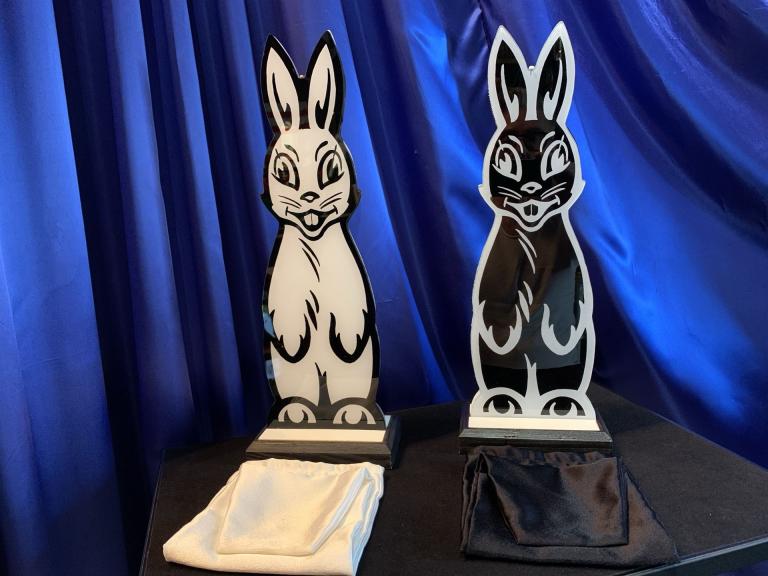 Stürmisch und schadenfroh fordert das Publikum, die Rückseiten der Hasen zu zeigen. Das macht Sie zunächst verlegen – Sie sträuben sich, suchen nach Ausreden. Doch schliesslich bleibt Ihnen keine Wahl mehr. Zögernd drehen Sie beide Hasen um – und das haut die Zuschauer um: Der weisse Hase ist nicht etwa, wie vermutet, auf der Rückseite schwarz, sondern knallrot! Und der schwarze Hase zeigt eine gelbe Rückseite!