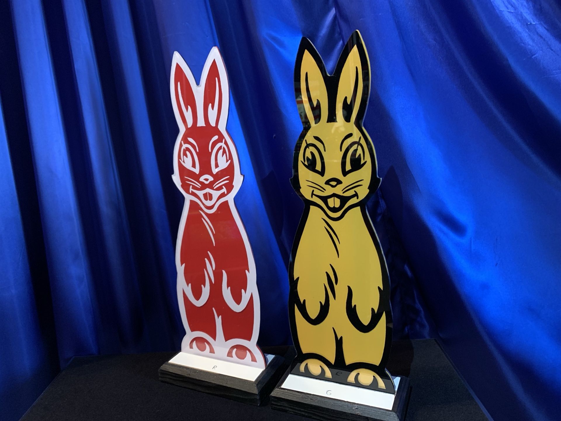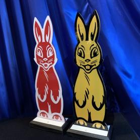 Die Hasen wurden aus hochwertigem Plexiglas gefertigt, wobei jeder Hase aus zwei Schichten besteht. Dadurch konnte die Bemalung auf beiden Seiten hinter Glas angebracht werden – das bedeutet: Die Farbe kann weder abblättern noch verkratzen, sie ist praktisch haltbar bis in alle Ewigkeit.