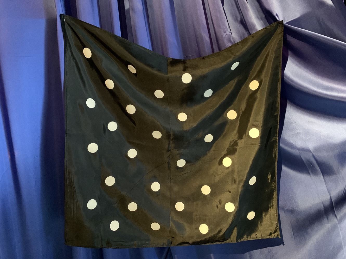 Ein grosses schwarzen Tuch mit grossen weissen Punkten wird von beiden Seiten vorgezeigt. Sie halten das Tuch nur an einer Ecke und schüttelt es. Da geschieht etwas ganz Unerwartetes: alle Punkte fallen vom Tuch, das dann wieder von beiden Seiten vorgezeigt wird. Jetzt nehmen Sie eine Handvoll "Punkte" auf, werfen sie hoch in die Luft und halten das Tuch in den herabfallenden Punkteregen. Nun geschieht das zweite Wunder: ein Teil der Punkte bleibt auf dem Tuch haften und dieses ist wieder mit Punkten gemustert. Wir liefern Ihnen das spezielle Tuch inklusive einiger Ersatzpunkte und deutscher Anleitung.