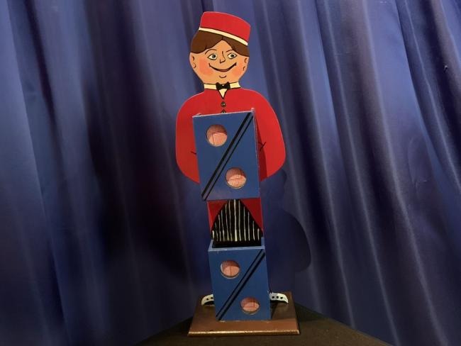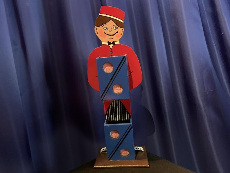 Drei Karten werden ausgewählt und in das Kartenspiel zurückgelegt, das in eine Houlette zu Füssen von Attaboy gelegt wird – einem 45 cm grossen, ausgeschnittenen Bild eines lächelnden Hotelpagen, der eine zweite Houlette an seiner Brust hält.