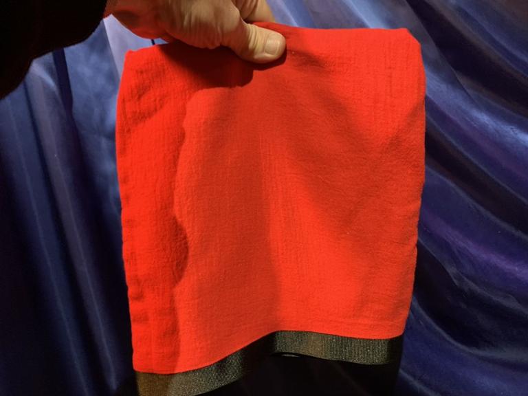 Sie zeigen z. B. einen blau geblümten Stoffbeutel, in dem Sie Ihre Zaubersachen aufbewahren. Griff in den Beutel: „Nichts drin!“ – der Beutel wird umgekrempelt, man sieht das rote Innenfutter.