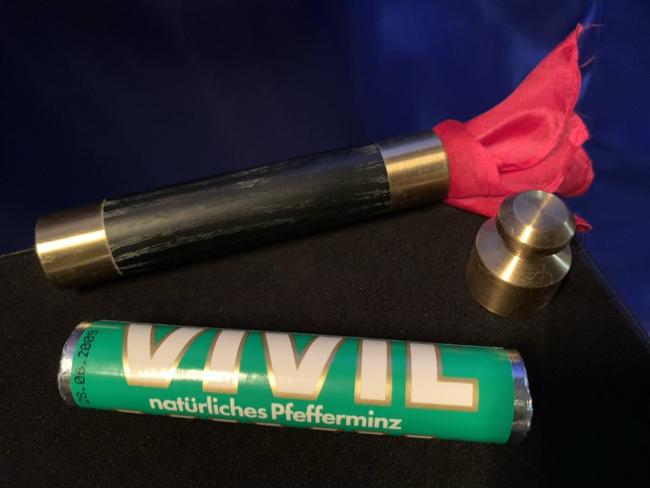 Eine untersuchte Röhre wird mit einem gedrehten Deckel verschlossen, eine Zuschauerin hält Röhre und Bonbons. Als Dank zeigen Sie, wie einfach man ein Tuch verschwinden lassen kann. Öffnet die Zuschauerin die Röhre, sind die Bonbons weg – stattdessen befindet sich das zuvor verschwundene Tuch in der Röhre; die Bonbons sind in Ihrer Tasche.