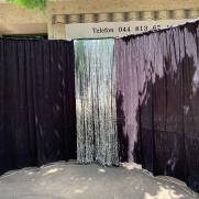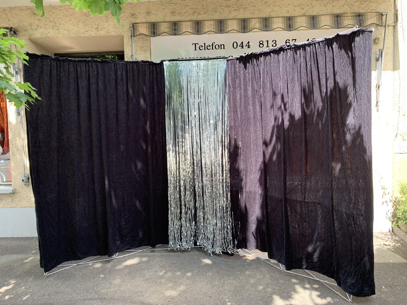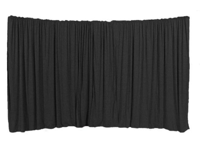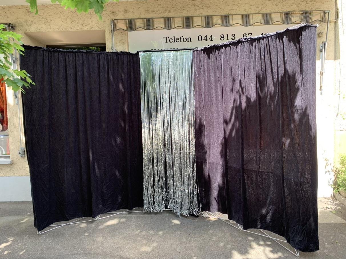 Mobiler Bühnenhintergrund (375 × 240 cm) mit stabilen Faltgestellen und Vorhang. Aufbau in wenigen Minuten.