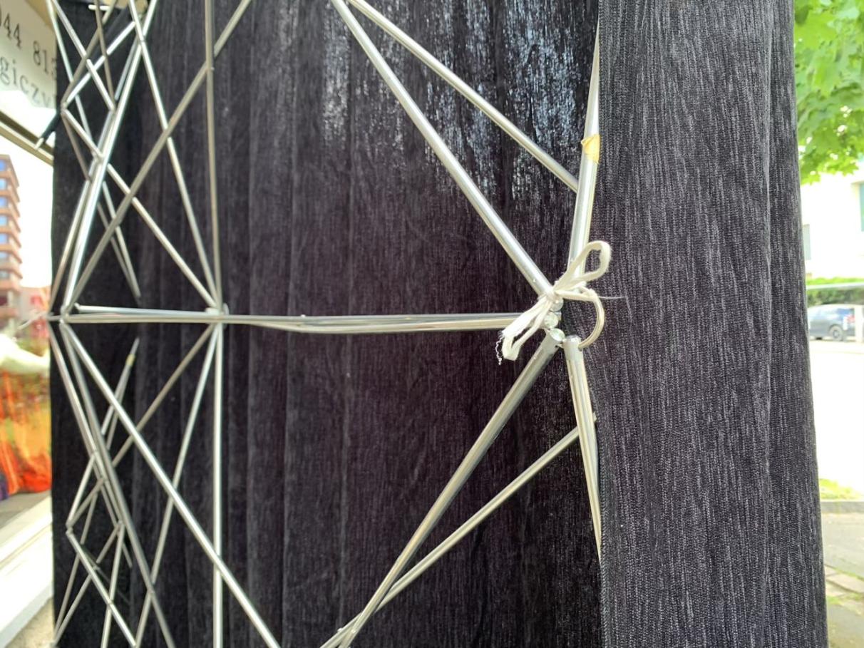Lieferumfang: 2 Faltgestelle, 2 Seitenvorhänge, 1 Durchgangsvorhang (Silber-Streifenvorhang), 4 Verbindungsstangen, 2 Stabilisierungsstangen, Packtasche mit Rollen, Anleitung.